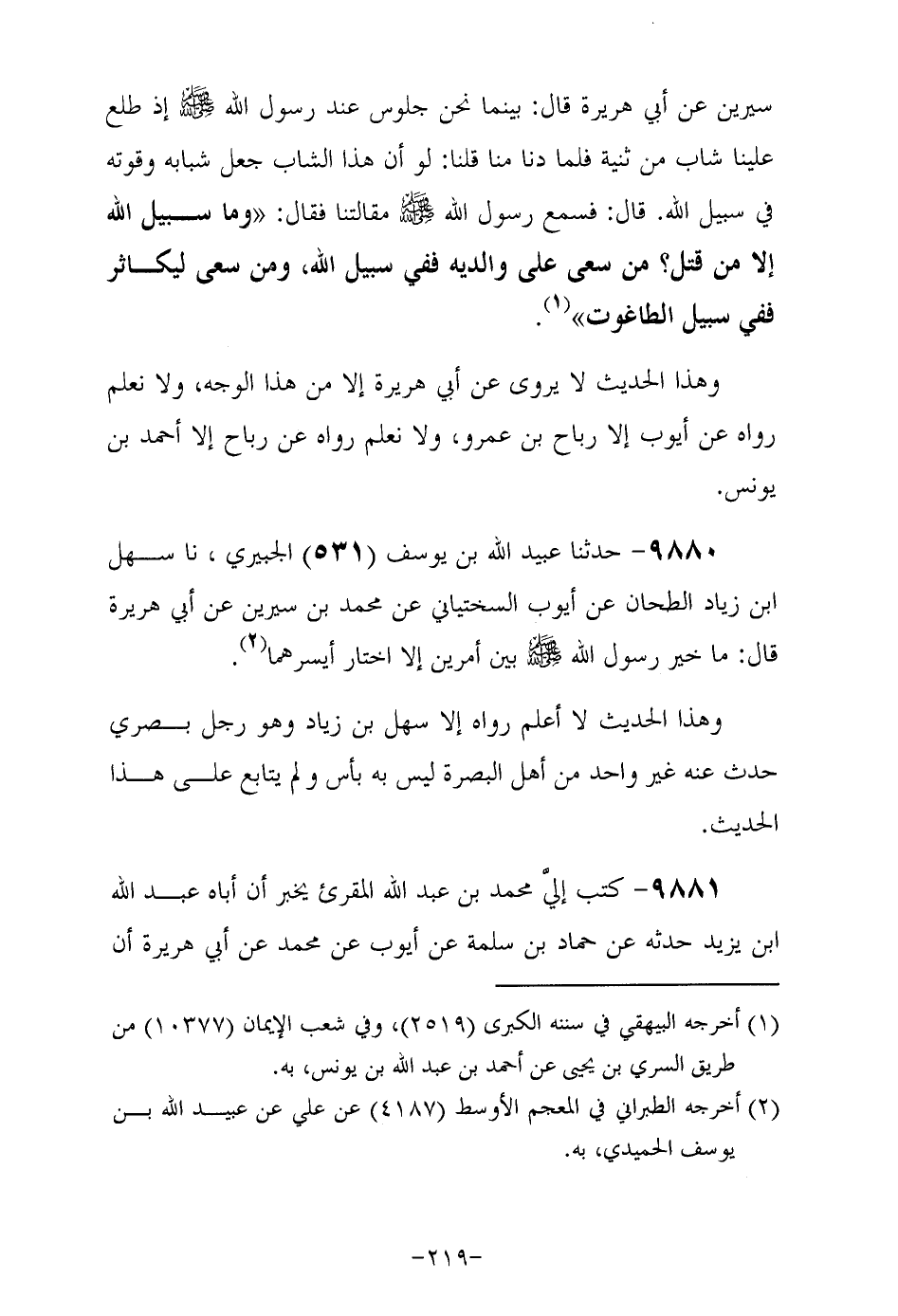 9880- حَدَّثَنا عبيد الله بن يوسف الجبيري , حَدَّثَنا سهل ابن زياد الطحان , عن أيوب السختياني , عن محمد بن سيرين , عَنْ أَبِي هُرَيْرَةَ رَضِيَ اللهُ عَنْهُ قال ما خير رَسُولُ اللَّهِ صَلَّى اللهُ عَلَيْهِ وَسَلَّمَ بَيْنَ أمرين إلا اختار أيسرهما.