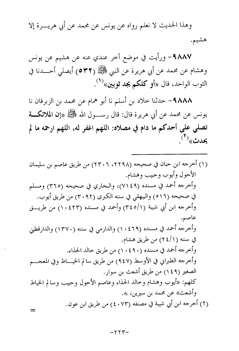9888- حَدَّثَنا خلاد بن أسلم , حَدَّثَنا أبو همام , عن مُحَمَّد بن الزبرقان , حَدَّثَنا يونس , عن مُحَمَّد , عَنْ أَبِي هُرَيْرَةَ رَضِيَ اللهُ عَنْهُ , قَالَ: قَالَ رَسُولُ اللهِ صَلَّى اللهُ عَلَيْهِ وَسَلَّمَ: إن الملائكة تصلي على أحدكم ما دام في مصلاه اللهم اغفر له اللهم ارحمه ما لم يحدث.