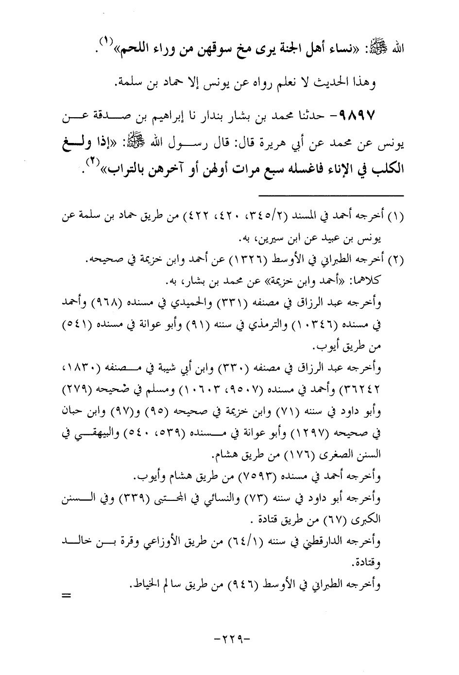 9897- حَدَّثَنا مُحَمَّد بن بشار بندار , حَدَّثَنا إبراهيم بن صدقة , عن يونس , عن مُحَمَّد , عَنْ أَبِي هُرَيْرَةَ رَضِيَ اللهُ عَنْهُ , قَالَ: قَالَ رَسُولُ اللهِ صَلَّى اللهُ عَلَيْهِ وَسَلَّمَ: إِذَا وَلِغَ الْكَلْبُ في الإناء فاغسله سبع مرات أولهن أو آخرهن بالتراب.