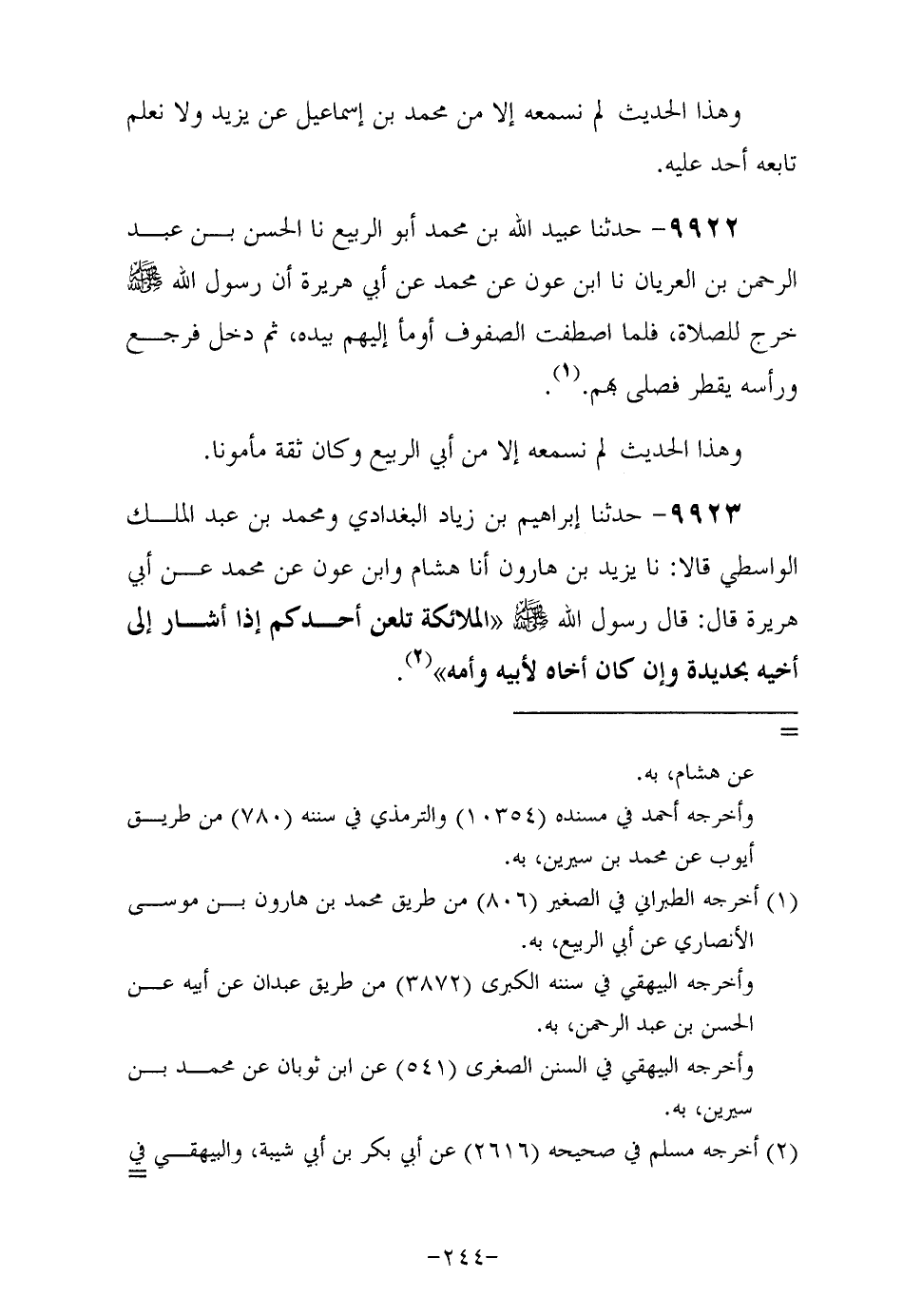 9923- حَدَّثَنا إبراهيم بن زياد البغدادي ومُحَمَّد بن عبد الملك الواسطي قَالاَ: حَدَّثَنا يزيد بن هارون , أَخْبَرنَا هشام وابن عون , عن مُحَمَّد , عَنْ أَبِي هُرَيْرَةَ رَضِيَ اللهُ عَنْهُ , قَالَ: قَالَ رَسُولُ اللهِ صَلَّى اللهُ عَلَيْهِ وَسَلَّمَ: الملائكة تلعن أحدكم إذا أشار إلى أخيه بحديدة وإن كان أخاه لأبيه وأمه.