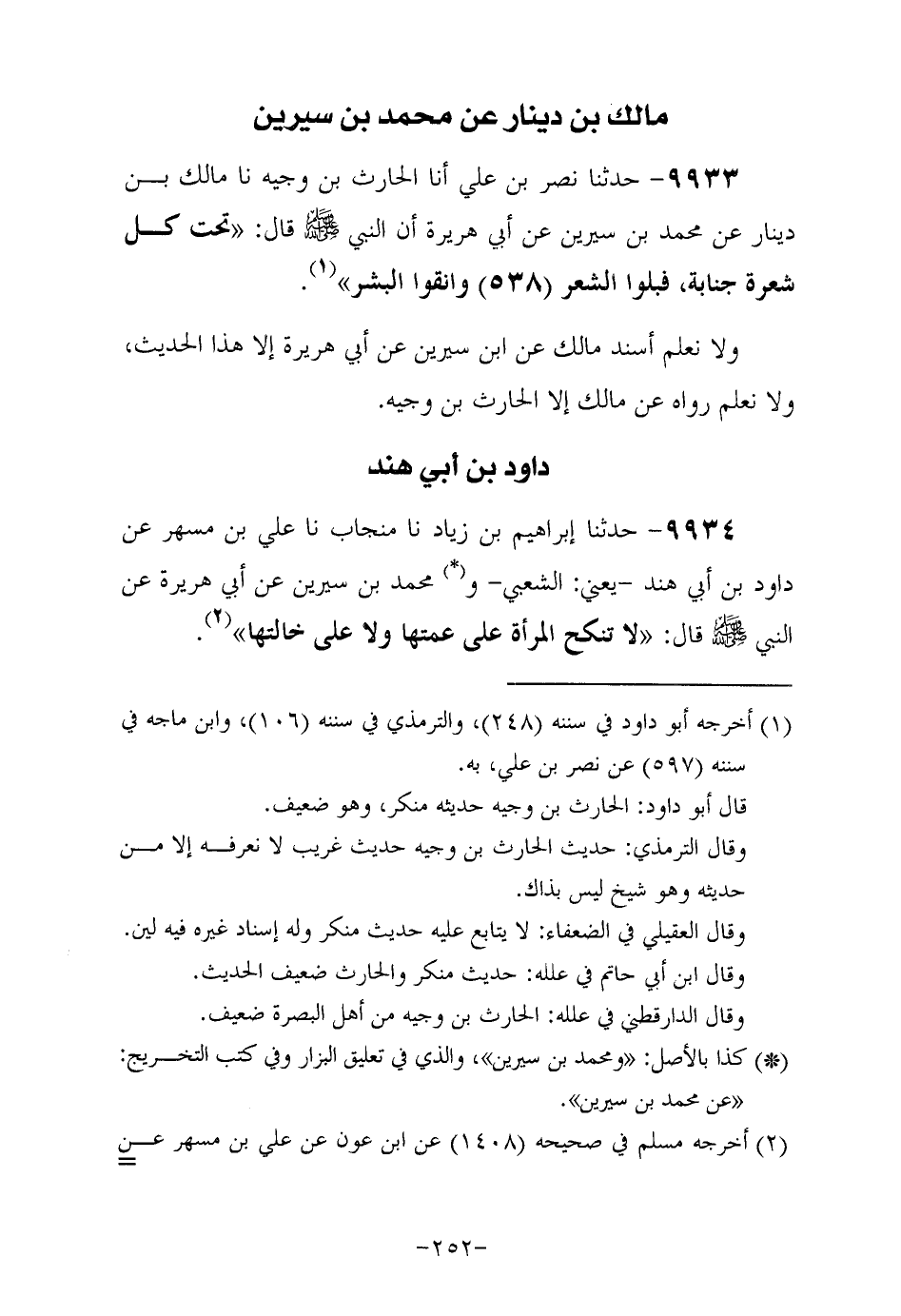 9933- حَدَّثَنا نصر بن علي , أَخْبَرنَا الحارث بن وجيه , حَدَّثَنا مالك بن دينار , عن محمد بن سيرين , عَنْ أَبِي هُرَيْرَةَ رَضِيَ اللهُ عَنْهُ , أَنَّ النَّبِي صَلَّى اللهُ عَلَيْهِ وَسَلَّمَ قال: تحت كل شعرة جنابة فبلوا الشعر وانقوا البشر.