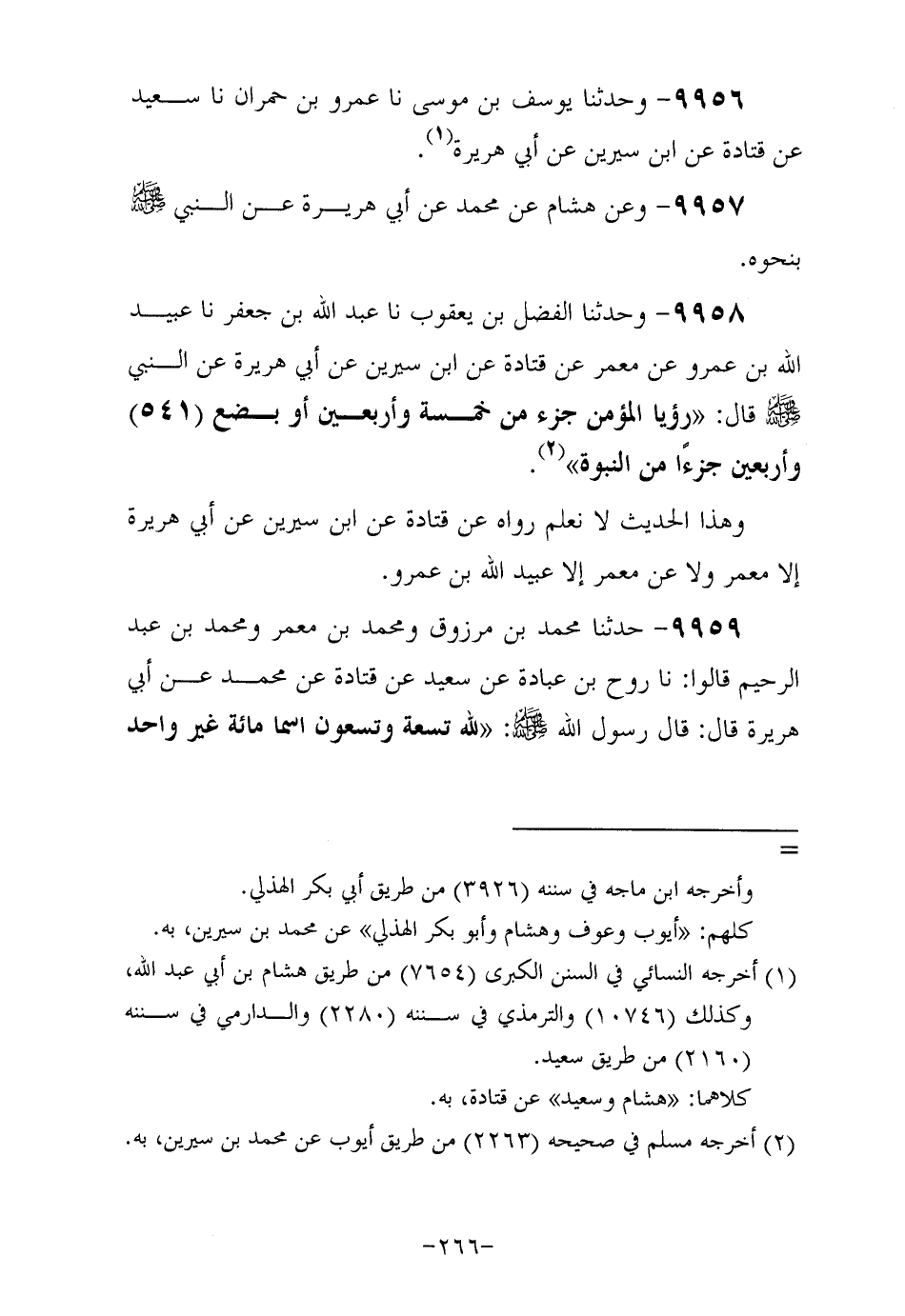 9959- حَدَّثَنا مُحَمَّد بن مرزوق ومُحَمَّد بن معمر ومُحَمَّد بن عبد الرحيم قالوا , حَدَّثَنا رَوْحُ بْنُ عُبَادَةَ , عَنْ سَعِيدٍ , عَنْ قَتَادةَ , عن مُحَمَّد , عَنْ أَبِي هُرَيْرَةَ رَضِيَ اللهُ عَنْهُ , قَالَ: قَالَ رَسُولُ اللهِ صَلَّى اللهُ عَلَيْهِ وَسَلَّمَ: لله تسعة وتسعون اسما مئة غير واحد من أحصاها دخل الجنة.