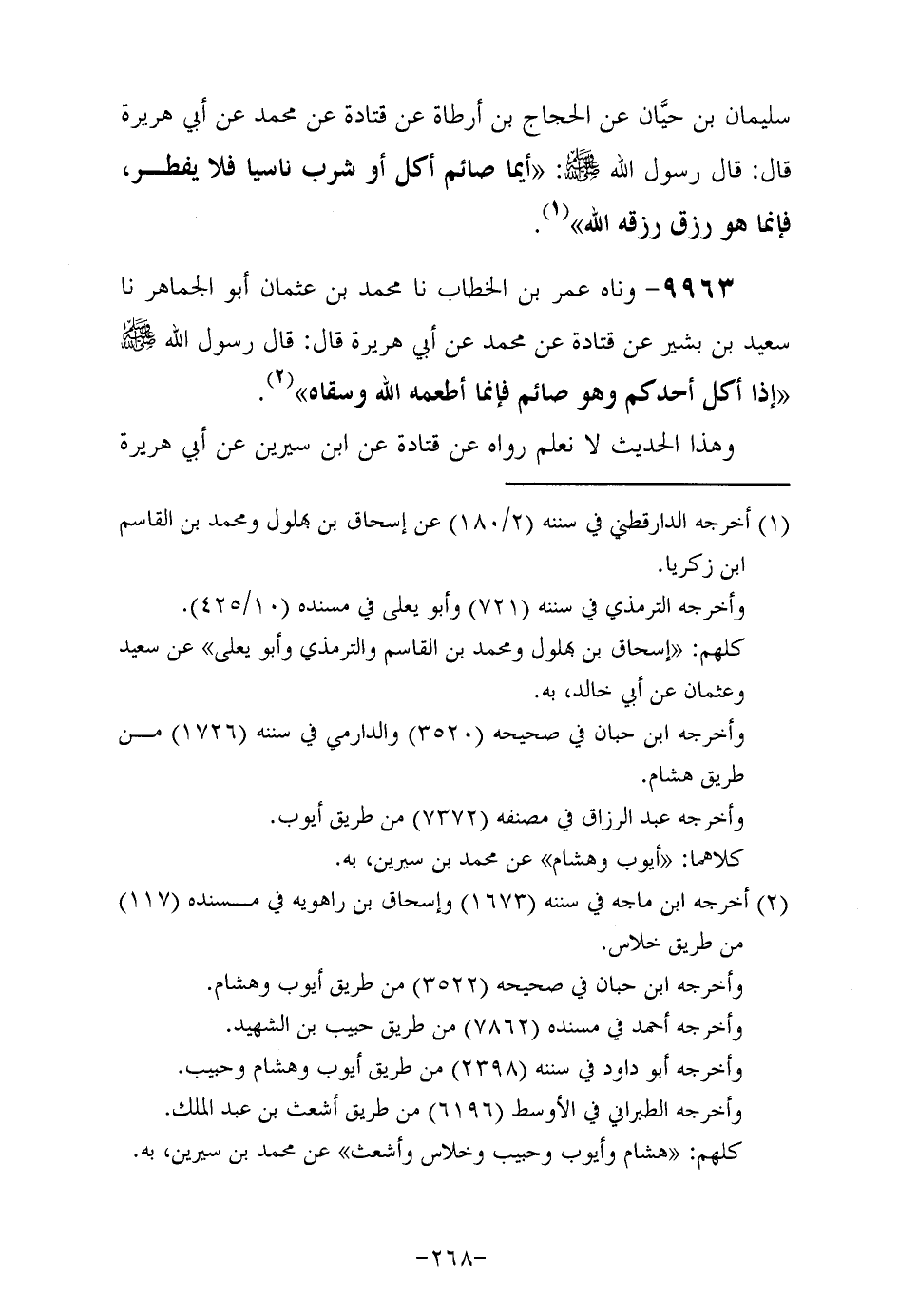 9963- وَحَدَّثَناه عمر بن الخطاب , حَدَّثَنا مُحَمَّد بن عثمان أبو الجماهر , حَدَّثَنا سعيد بن بشير , عَنْ قَتَادةَ , عن مُحَمَّد , عَنْ أَبِي هُرَيْرَةَ رَضِيَ اللهُ عَنْهُ , قَالَ: قَالَ رَسُولُ اللهِ صَلَّى اللهُ عَلَيْهِ وَسَلَّمَ: إذا أكل أحدكم وهو صائم فإنما أطعمه الله وسقاه.