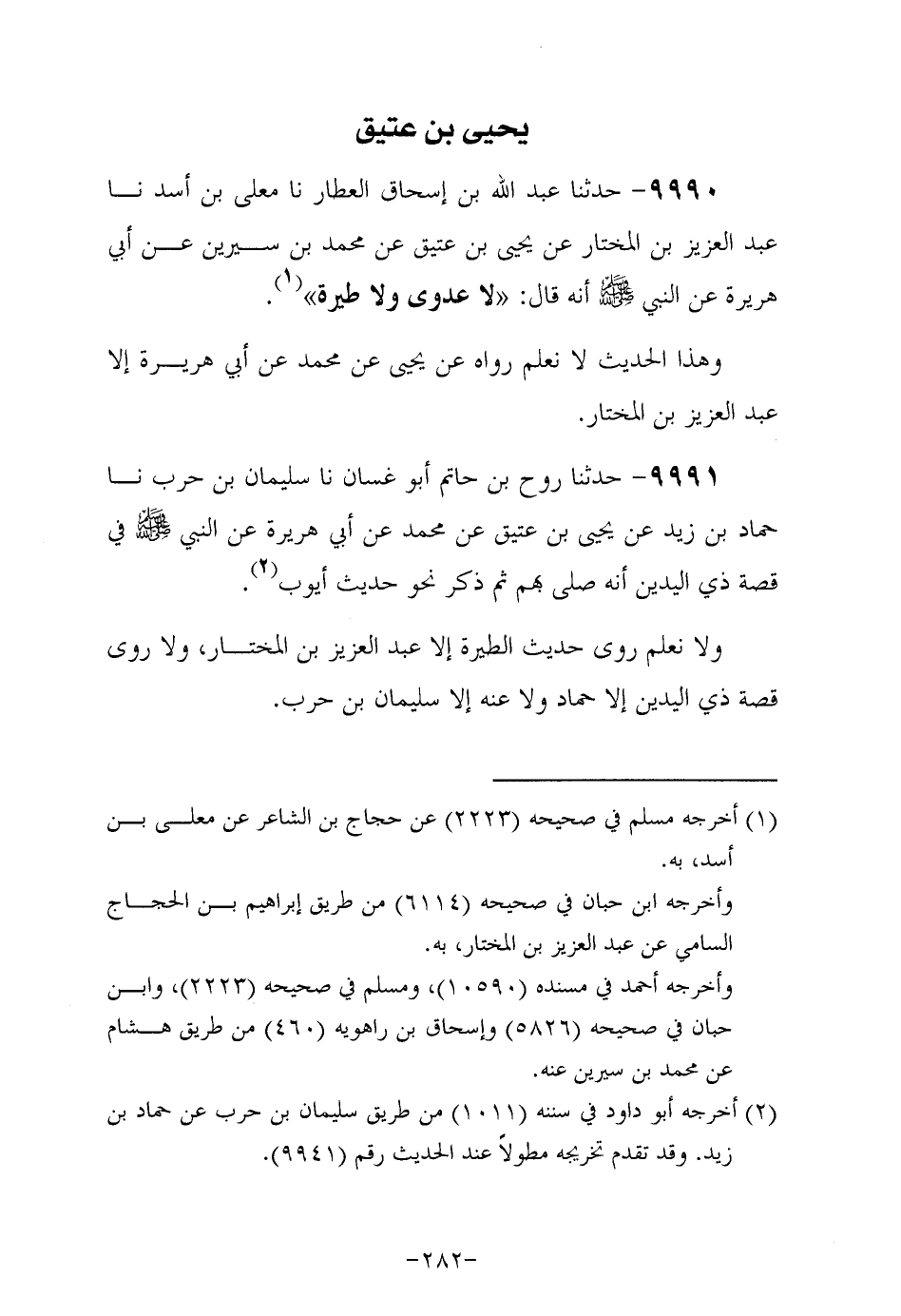 9990- حَدَّثَنا عبد الله بن إسحاق العطار , حَدَّثَنا معلى بن أسد , حَدَّثَنا عبد العزيز بن المختار , عن يحيى بن عتيق , عن محمد بن سيرين , عَنْ أَبِي هُرَيْرَةَ رَضِيَ اللهُ عَنْهُ , عَنِ النَّبِيِّ صَلَّى اللهُ عَلَيْهِ وَسَلَّمَ , أَنَّهُ قَالَ: لا عدوى ولا طيرة.