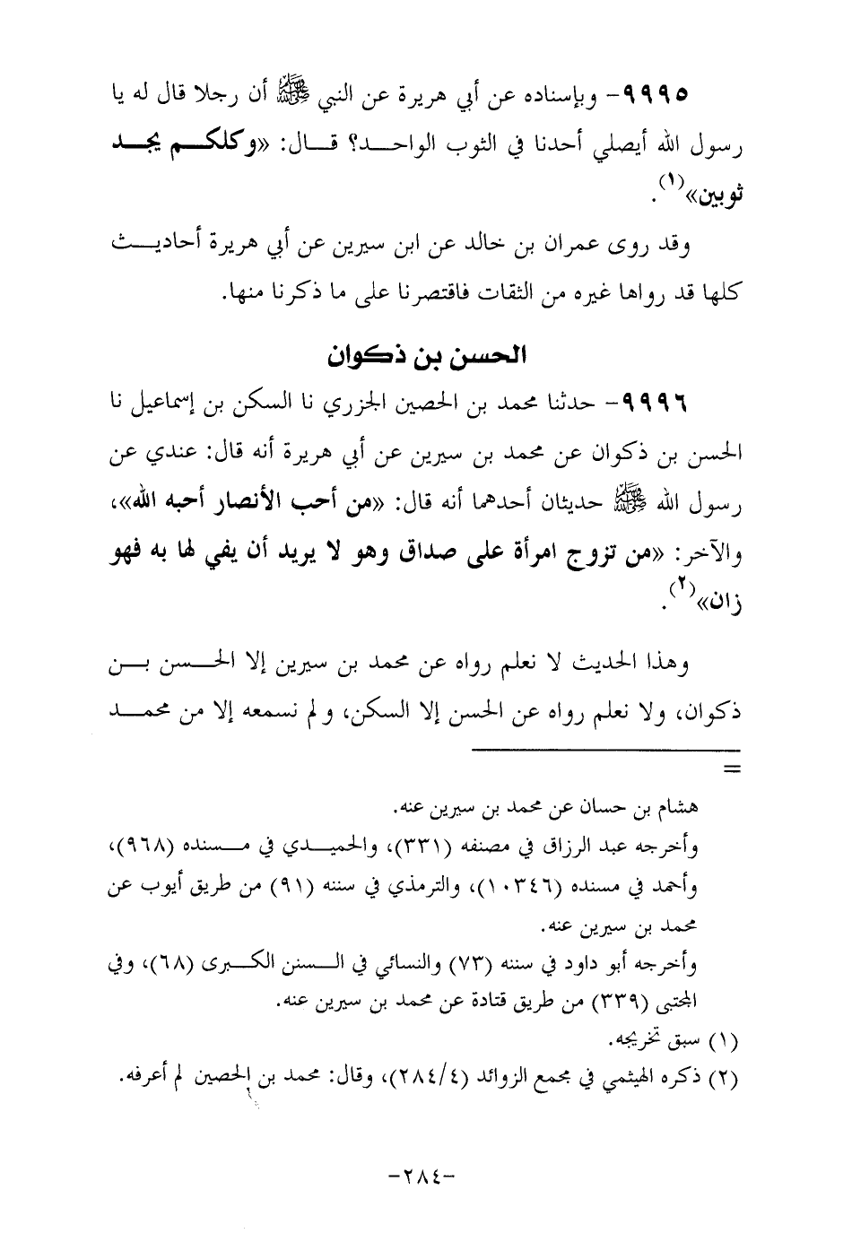 وَهَذَا الحديثُ لاَ نَعْلَمُ رَوَاهُ عَنْ مُحَمَّدٍ بن سيرين إلا الحَسَن بن ذكوان , ولاَ نَعْلَمُ رَوَاهُ عن الحسن إلا السكن ولم نسمعه إلا من مُحَمَّد بن حصين وقد كان عند غيره.