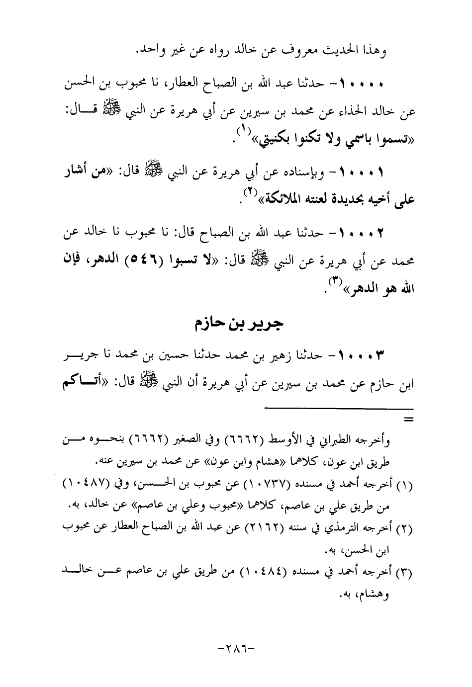 10002- حَدَّثَنا عبد الله بن الصباح قال: حَدَّثَنا محبوب , حَدَّثَنا خالد , عن مُحَمَّد , عَنْ أَبِي هُرَيْرَةَ رَضِيَ اللهُ عَنْهُ , عَنِ النَّبِي صَلَّى اللهُ عَلَيْهِ وَسَلَّمَ قَالَ: لا تسبوا الدهر فإن الله هو الدهر.