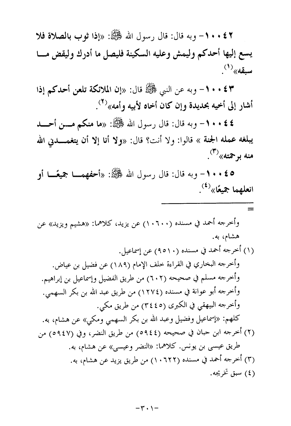 10042- وَبِهِ قَالَ: قَالَ رَسُولُ اللهِ صَلَّى اللهُ عَلَيْهِ وَسَلَّمَ: إذا ثوب بالصلاة فلا يسع إليها أحدكم وليمش وعليه السكينة فليصل ما أدرك وليقض ما سبقه.