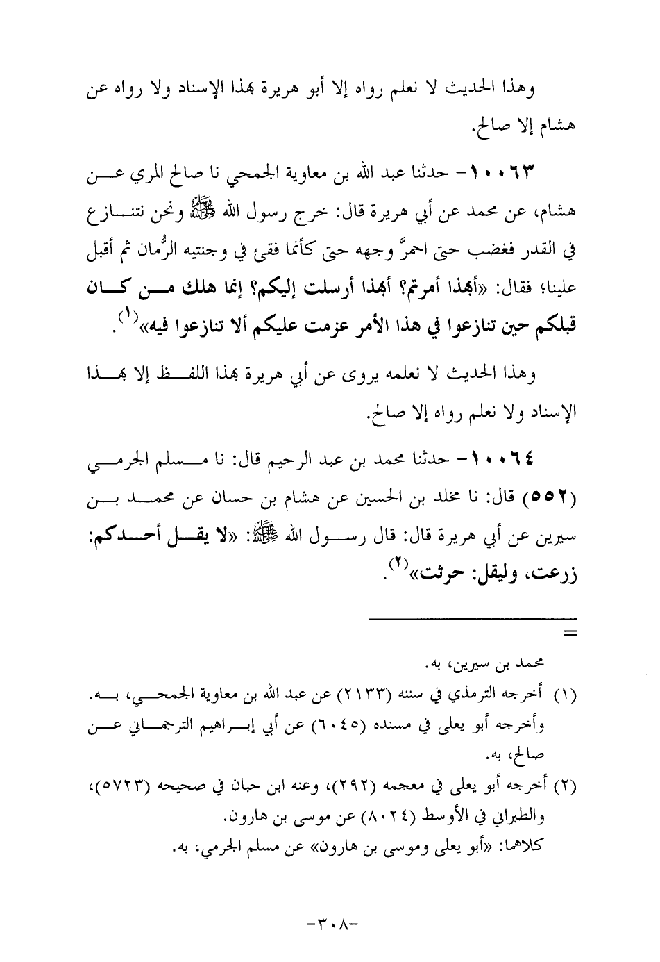 10063- حَدَّثَنا عبد الله بن معاوية الجمحي , حَدَّثَنا صالح المري , عن هشام , عن مُحَمَّد , عَنْ أَبِي هُرَيْرَةَ رَضِيَ اللهُ عَنْهُ , قَالَ خَرَجَ رَسُولُ اللَّهِ صَلَّى اللهُ عَلَيْهِ وَسَلَّمَ ونحن نتنازع في القدر فغضب حتى احمر وجهه حتى كأنما فقئ في وجنتيه الرمان ثم أقبل علينا فقال أبهذا أمرتم أبهذا أرسلت إليكم إنما هلك من كان قبلكم حين تنازعوا في هذا الأمر عزمت عليكم ألا تنازعوا فِيهِ.