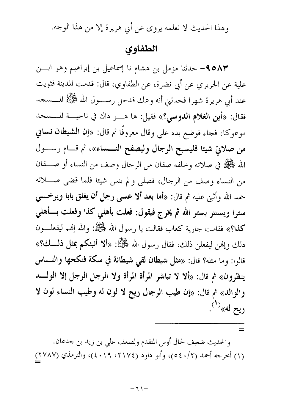 9583- حَدَّثَنا مؤمب بن هشام حَدَّثَنا إسماعيل بن إبراهيم وهو ابن عُلية , عن الجريري , عن أبي نضرة , عن الطفاوي قال قدمت المدينة فثويت عند أبي هريرة رَضِيَ اللهُ عَنْهُ شهرا فحدثني أنه وعك فَدَخَلَ رَسُولُ اللَّهِ صَلَّى اللهُ عَلَيْهِ وَسَلَّمَ المسجد فقال: أين الغلام الدوسي؟ فقيل: هاهو ذاك في ناحية المسجد موعوكا. فجاء فوضع يده علي وقال معروفا , ثم قال: إن الشيطان نساني من صلاتي شيئا فليسبح الرجال وليصفح النساء ثم قَامَ رَسُولُ اللَّهِ صَلَّى اللهُ عَلَيْهِ وَسَلَّمَ في صلاة وخلفه صفان من الرجال وصف من النساء، أو صفان من النساء وصف من الرجال فصلى ولم ينسى شيئا , فلما قضى صلاته حمد اللَّهَ وَأَثْنَى عَلَيْهِ ثُمَّ قَالَ: أَمَّا بَعْدُ ألا عسى رجل يغلق بابا ويرخي سترا ويستتر بستر الله ثم يخرج فيقول: فعلت بأهلي كذا وفعلت بأهلي كذا. فقامت جارية كعاب فقالت: يا رسول الله والله إنهم ليفعلون ذلك وإنهن ليفعلن ذَلِكَ , فقَالَ رَسُولُ اللهِ صَلَّى اللهُ عَلَيْهِ وَسَلَّمَ: ألا أنبئكم بمثل ذلك قالوا وما مثله؟ قال: كمثل شيطان لقي شيطانة في سكة فنكحها والناس ينظرون , ثم قال: ألا لا تباشر المرأة المرأة ولا الرجل الرجل إلا الولد والوالد ثم قال: إن طيب الرجال ريح لا لون له وطيب النساء لون لا ريح لَهُ.