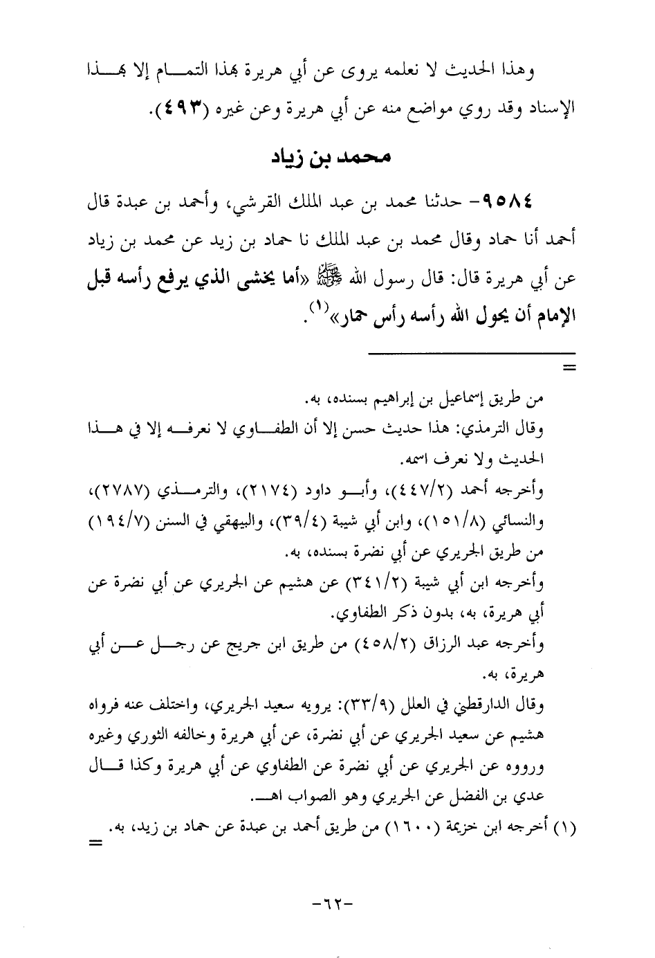 9584- حَدَّثَنا محمد بن عبد الملك القرشي وأحمد بن عبدة قال أحمد أَخْبَرنا حماد وقال محمد بن عبد الملك حَدَّثَنا حماد بن زيد , عن محمد بن زياد , عَنْ أَبِي هُرَيْرَةَ رَضِيَ اللهُ عَنْهُ , قَالَ: قَالَ رَسُولُ اللهِ صَلَّى اللهُ عَلَيْهِ وَسَلَّمَ: أما يخشى الذي يرفع رأسه قبل الإمام أن يحول الله رأسه رأس حمار.