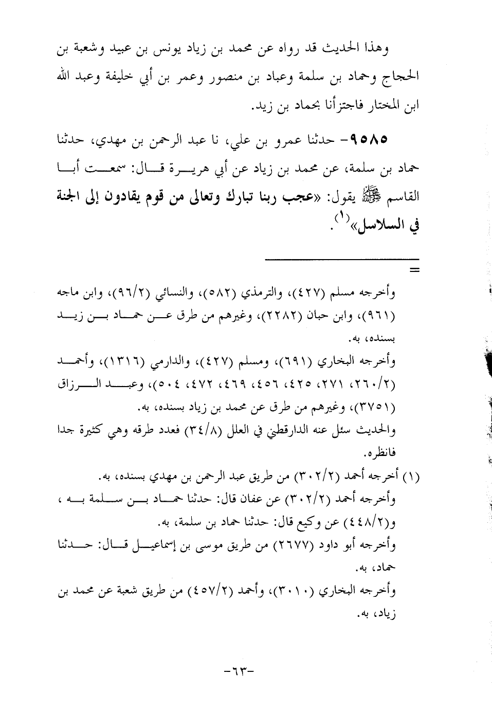 9585- حَدَّثَنا عمرو بن علي حَدَّثَنا عبد الرحمن بن مهدي حَدَّثَنا حماد بن سلمة , عن محمد بن زياد , عَنْ أَبِي هُرَيْرَةَ رَضِيَ اللهُ عَنْهُ , قَالَ: سَمِعْتُ أَبَا الْقَاسِمِ صَلَّى اللهُ عَلَيْهِ وَسَلَّمَ يقول عجب ربنا تبارك وتعالى من قوم يقادون إلى الجنة في السلاسل.