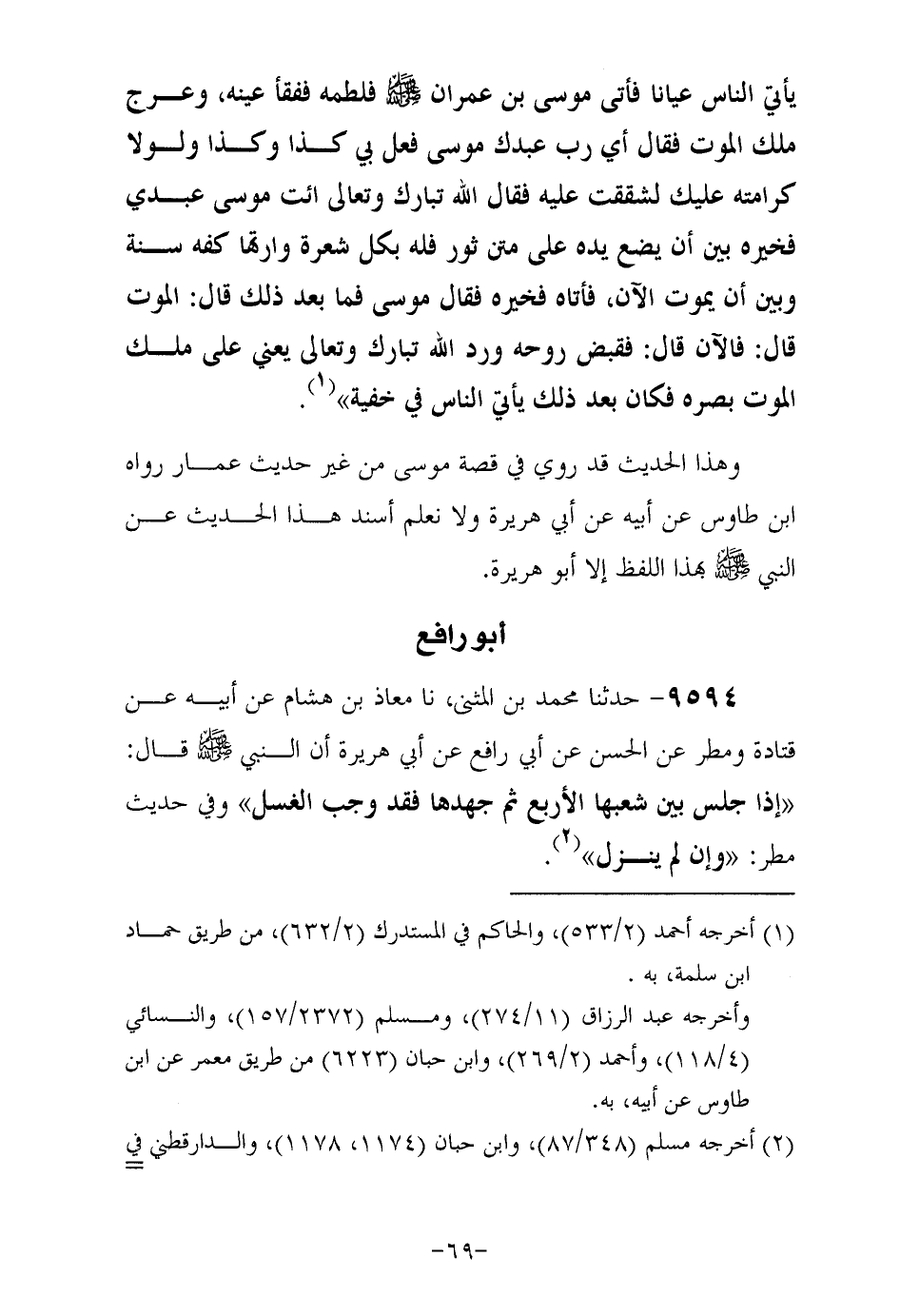9594- حَدَّثَنا مُحَمَّدُ بْنُ الْمُثَنَّى حَدَّثَنا مُعَاذُ بْنُ هشام , عن أبيه , عَنْ قَتَادةَ ومطر , عن الْحَسَنِ عن أبي رافع , عَنْ أَبِي هُرَيْرَةَ رَضِيَ اللهُ عَنْهُ , أن قال إذا جلس بين شعبها الأربع ثم جهها فقد وجب الغسل.