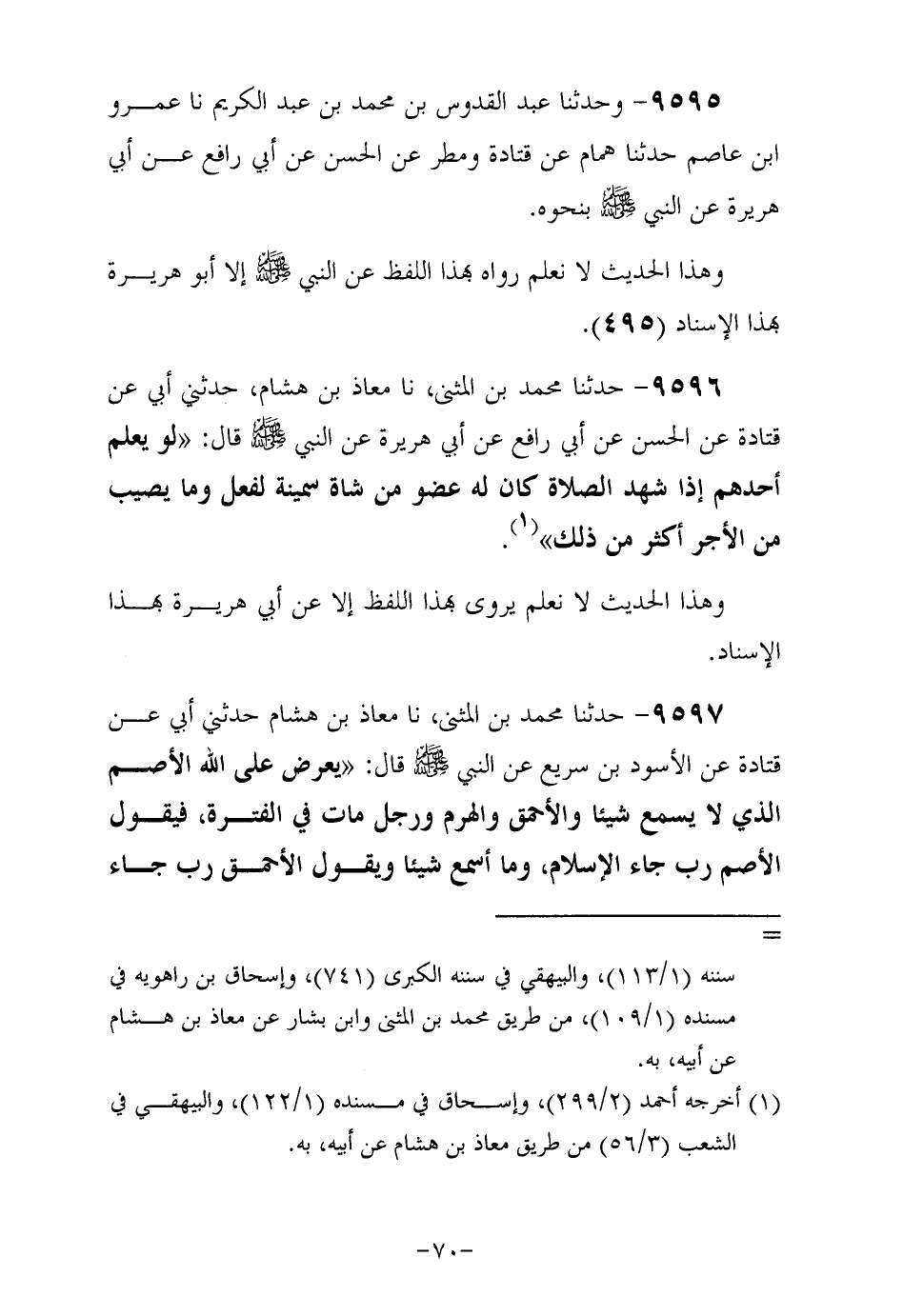 9597- حَدَّثَنا مُحَمَّدُ بْنُ الْمُثَنَّى حَدَّثَنا مُعَاذُ بْنُ هِشَامٍ حَدَّثَنِي أَبِي , عَنْ قَتَادةَ , عَنِ الأَسْوَدِ بْنِ سَرِيعٍ , عَنِ النَّبِي صَلَّى اللهُ عَلَيْهِ وَسَلَّمَ قال: يعرض على لله الأصم الذي لا يسمع شيئا والأحمق والهرم ورجل مات في الفترة فيقول الأصم رب جاء الإسلام وما أسمع شيئا ويقول الأحمق رب جاء الإسلام وما أعقل شيئا ويقول الذي مات في الفترة رب ما أتاني لك من رسول قال أبو بكر البزار وذهب عني ما قال الرابع قال فيأخذ مواثيقهم ليطيعنه فيرسل إليهم تبارك وتعالى أدخلوا النار فوالذي نفس محمد بيده لو دخلوها لكانت عليهم بردا وسلاما.