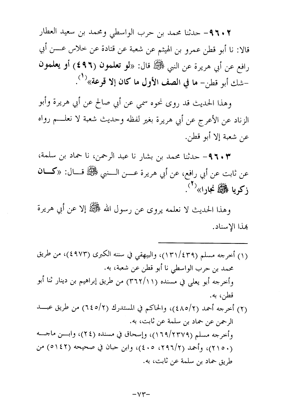 9602- حَدَّثَنا محمد بن حرب الواسطي ومحمد بن سعيد العطار قالا حَدَّثَنا أبو قطن عمرو بن الهيثم , عن شعبة , عَنْ قَتَادةَ , عن خلاس , عن أبي رافع , عَنْ أَبِي هُرَيْرَةَ رَضِيَ اللهُ عَنْهُ , عَنِ النَّبِي صَلَّى اللهُ عَلَيْهِ وَسَلَّمَ قَالَ: لَوْ تعلمون أو يعلمون شك أبو قطن ما في الصف الأول ما كان إلا قرعة.