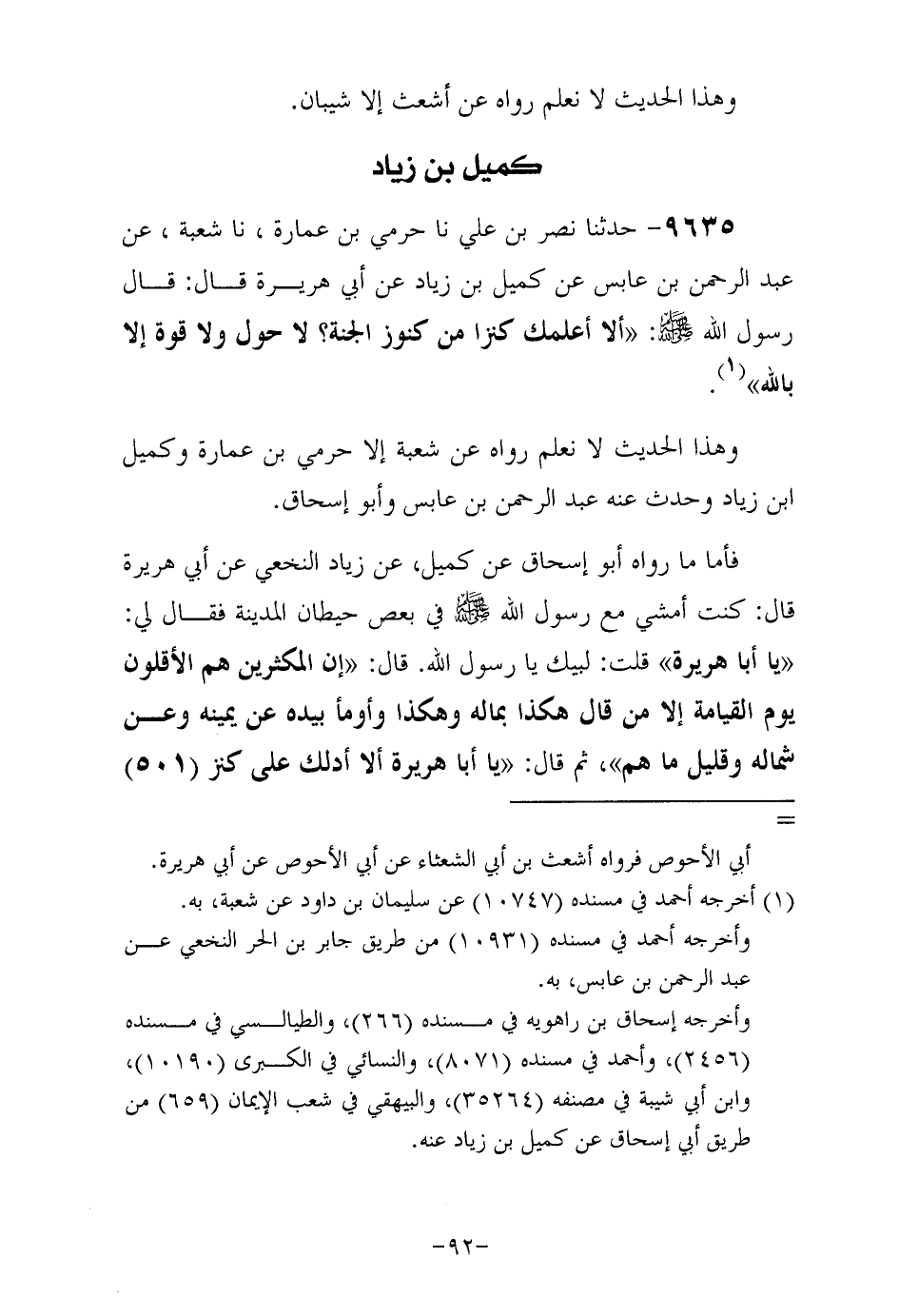 9635- حَدَّثَنا نصر بن علي , حَدَّثَنا حرمي بن عمارة حَدَّثَنا شُعْبة , عن عبد الرحمن بن عباس , عن كُمَيْل بن زِيَاد , عَنْ أَبِي هُرَيْرَةَ رَضِيَ اللهُ عَنْهُ , قَالَ: قَالَ رَسُولُ اللهِ صَلَّى اللهُ عَلَيْهِ وَسَلَّمَ: ألا أعلمك كنز من كنوز الجنة لاَ حولَ وَلاَ قُوَّةَ إِلاَّ بِاللهِ.