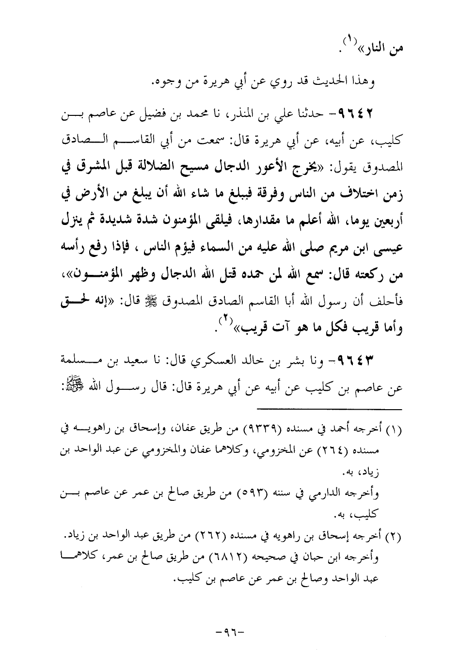 9642- حَدَّثَنا علي بن المنذر , حَدَّثَنا مُحَمَّد بن فضيل , عَنْ عَاصِمِ بْنِ كُلَيْبٍ , عَنْ أَبِيهِ , عَنْ أَبِي هُرَيْرَةَ رَضِيَ اللهُ عَنْهُ , قال: سمعت من أبي القاسم الصادق المصدوق يقول يخرج الأعور الدجال مسيح الضلالة قبل المشرق في زمن اختلاف من الناس وفرقة فيبلغ ما شاء الله أن يبلغ من الأرض في أربعين يوما الله أعلم ما مقدارها؟ فيلقى المؤمنون شدة شديدة، ثم ينزل عيسى بن مريم صَلَّى اللهُ عَلَيْهِ من السماء فيقوم الناس فإذا رفع رأسه من ركعته قال: سمع الله لمن حمده قتل الله الدجال وظهر المؤمنون فأحلف أَنَّ رَسُولَ اللَّهِ صَلَّى اللهُ عَلَيْهِ وَسَلَّمَ أبا القاسم الصادق المصدوق صَلَّى اللهُ عَلَيْهِ وَسَلَّمَ قال: إنه لحق وأما قريب فكل ما هو آت قريب.