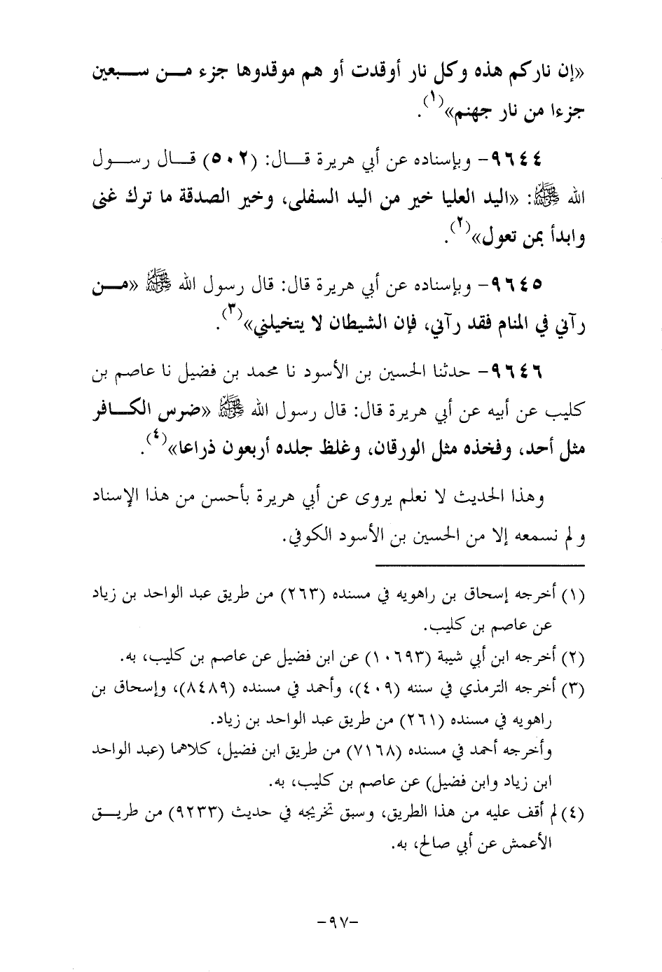 9646- حَدَّثَنا الحُسَين بن الأسود , حَدَّثَنا مُحَمَّد بن فضيل , حَدَّثَنا عاصم بن كليب , عن أبيه , عَنْ أَبِي هُرَيْرَةَ رَضِيَ اللهُ عَنْهُ , قَالَ: قَالَ رَسُولُ اللهِ صَلَّى اللهُ عَلَيْهِ وَسَلَّمَ: ضرس الكافر مثل أحد وفخذه مثل الرقان وغلظ جلده أربعون ذراعا.