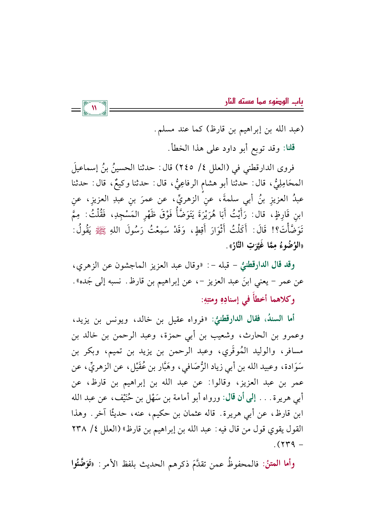 فروى الدارقطني في (العلل ٤/ ٢٤٥) قال: حدثنا الحسينُ بنُ إسماعيلَ المحَامِلِيُّ، قال: حدثنا أبو هشامٍ الرفاعِيُّ، قال: حدثنا وكيعٌ، قال: حدثنا عبدُ العزيزِ بنُ أبي سلمةَ، عنِ الزهريِّ، عن عمرَ بنِ عبدِ العزيزِ، عنِ ابنِ قَارِظٍ، قال: رَأَيْتُ أَبَا هُرَيْرَةَ يَتَوَضَّأُ فَوْقَ ظَهْرِ المَسْجِدِ، فَقُلْتُ: مِمَّ تَوَضَّأْتَ؟ ! قَالَ: أَكَلْتُ أَثْوَارَ أَقِطٍ، وَقَدْ سَمِعْتُ رَسُولَ اللهِ صلى الله عليه وسلم يَقُولُ: ((الوُضُوءُ مِمَّا غَيَّرَتِ النَّارُ)).