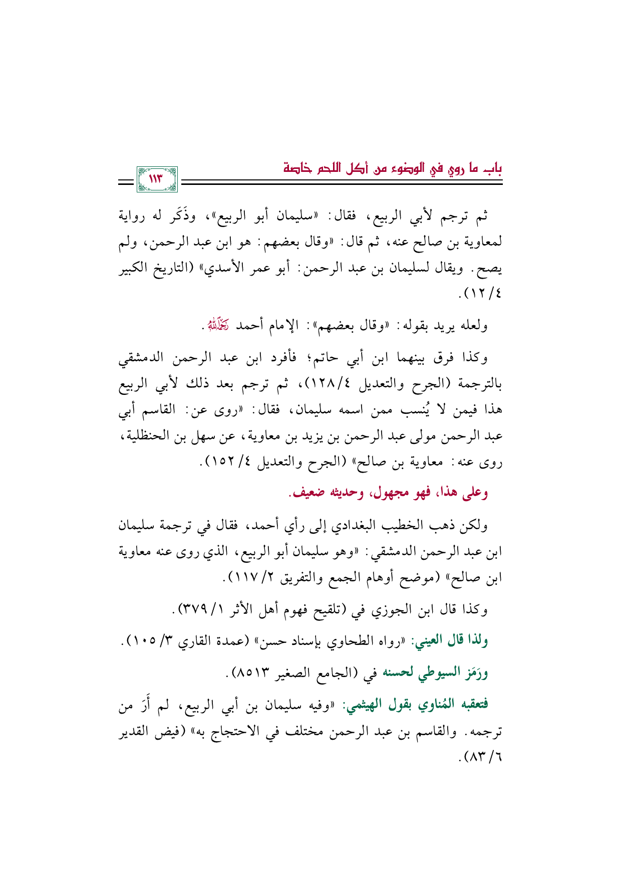 وكذا فرق بينهما ابن أبي حاتم؛ فأفرد ابن عبد الرحمن الدمشقي بالترجمة (الجرح والتعديل ٤/ ١٢٨)، ثم ترجم بعد ذلك لأبي الربيع هذا فيمن لا يُنسب ممن اسمه سليمان، فقال: ((روى عن: القاسم أبي عبد الرحمن مولى عبد الرحمن بن يزيد بن معاوية، عن سهل بن الحنظلية، روى عنه: معاوية بن صالح)) (الجرح والتعديل ٤/ ١٥٢).