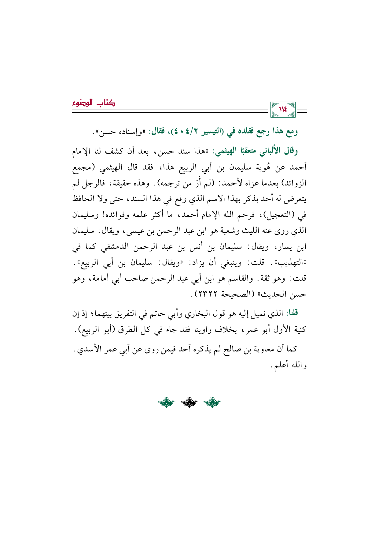 وقال الألباني متعقبًا الهيثمي: ((هذا سند حسن، بعد أن كشف لنا الإمام أحمد عن هُوية سليمان بن أبي الربيع هذا، فقد قال الهيثمي (مجمع الزوائد) بعدما عزاه لأحمد: (لم أَرَ من ترجمه). وهذه حقيقة، فالرجل لم يتعرض له أحد بذكر بهذا الاسم الذي وقع في هذا السند، حتى ولا الحافظ في (التعجيل)، فرحم الله الإمام أحمد، ما أكثر علمه وفوائده! وسليمان الذي روى عنه الليث وشعبة هو ابن عبد الرحمن بن عيسى، ويقال: سليمان بن يسار، ويقال: سليمان بن أنس بن عبد الرحمن الدمشقي كما في "التهذيب". قلت: وينبغي أن يزاد: "ويقال: سليمان بن أبي الربيع". قلت: وهو ثقة. والقاسم هو ابن أبي عبد الرحمن صاحب أبي أمامة، وهو حسن الحديث" (الصحيحة ٢٣٢٢).