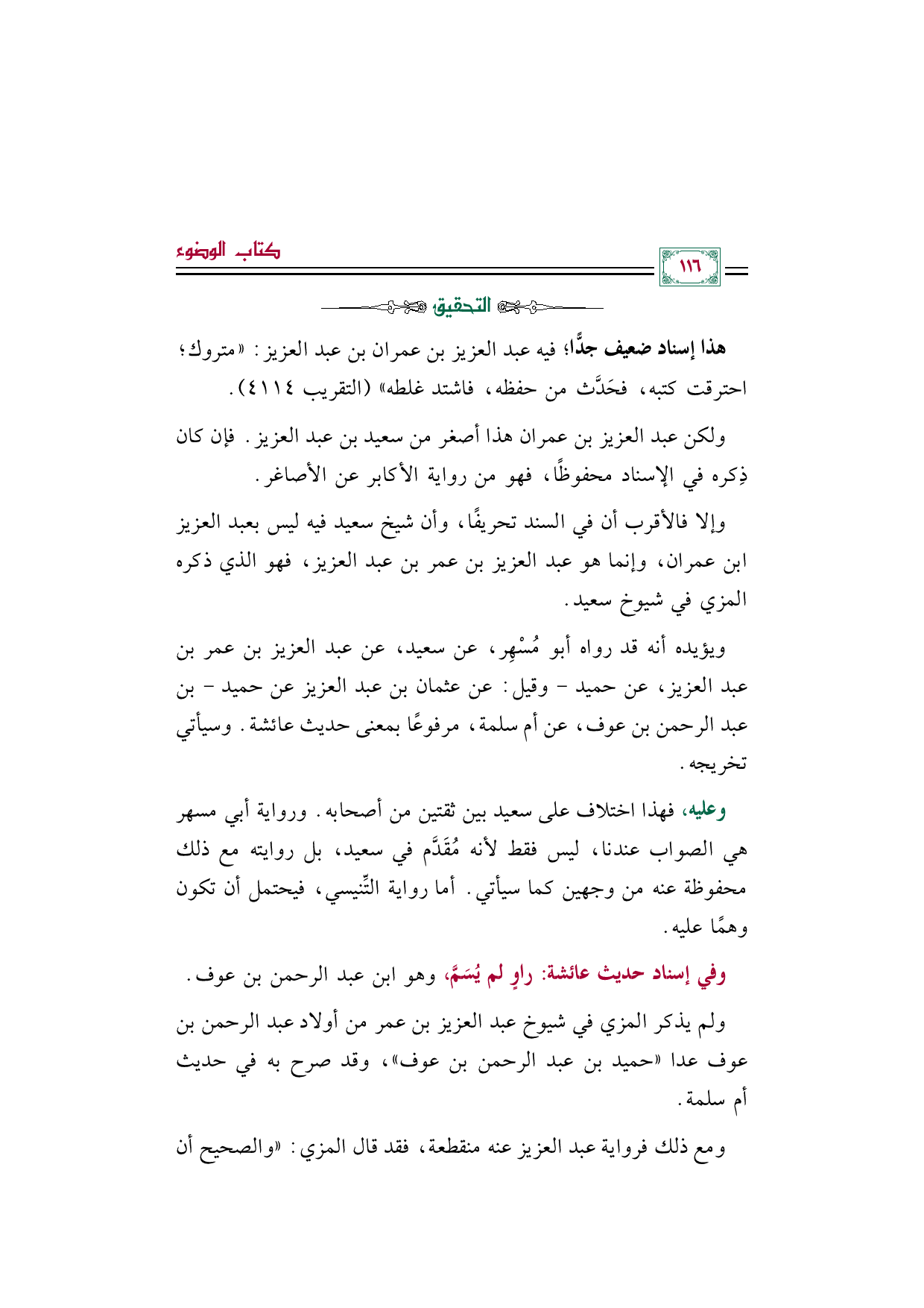 وإلا فالأقرب أن في السند تحريفًا، وأن شيخ سعيد فيه ليس بعبد العزيز بن عمران، وإنما هو عبد العزيز بن عمر بن عبد العزيز، فهو الذي ذكره المزي في شيوخ سعيد.