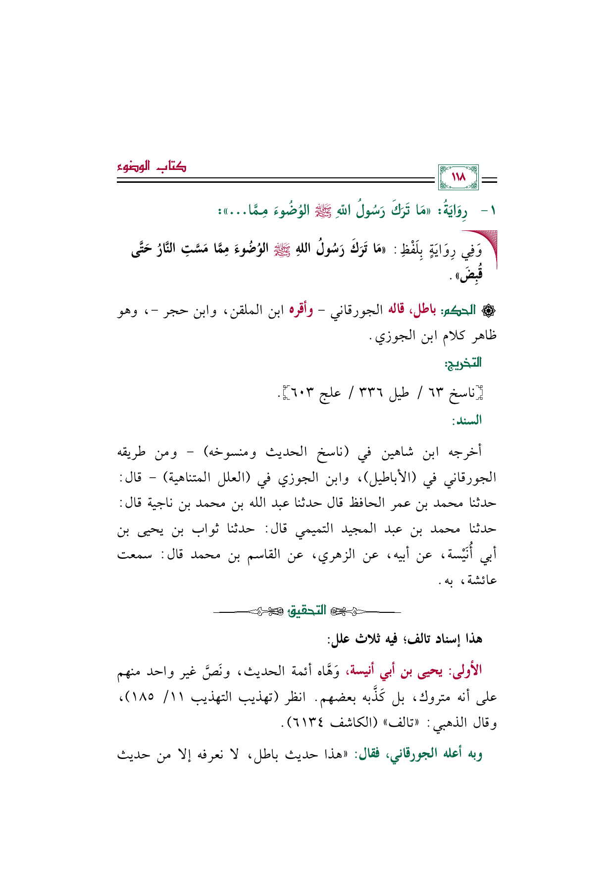 أخرجه ابن شاهين في (ناسخ الحديث ومنسوخه) - ومن طريقه الجورقاني في (الأباطيل)، وابن الجوزي في (العلل المتناهية) - قال: حدثنا محمد بن عمر الحافظ قال حدثنا عبد الله بن محمد بن ناجية قال: حدثنا محمد بن عبد المجيد التميمي قال: حدثنا ثواب بن يحيى بن أبي أُنَيْسة، عن أبيه، عن الزهري، عن القاسم بن محمد قال: سمعت عائشة، به.