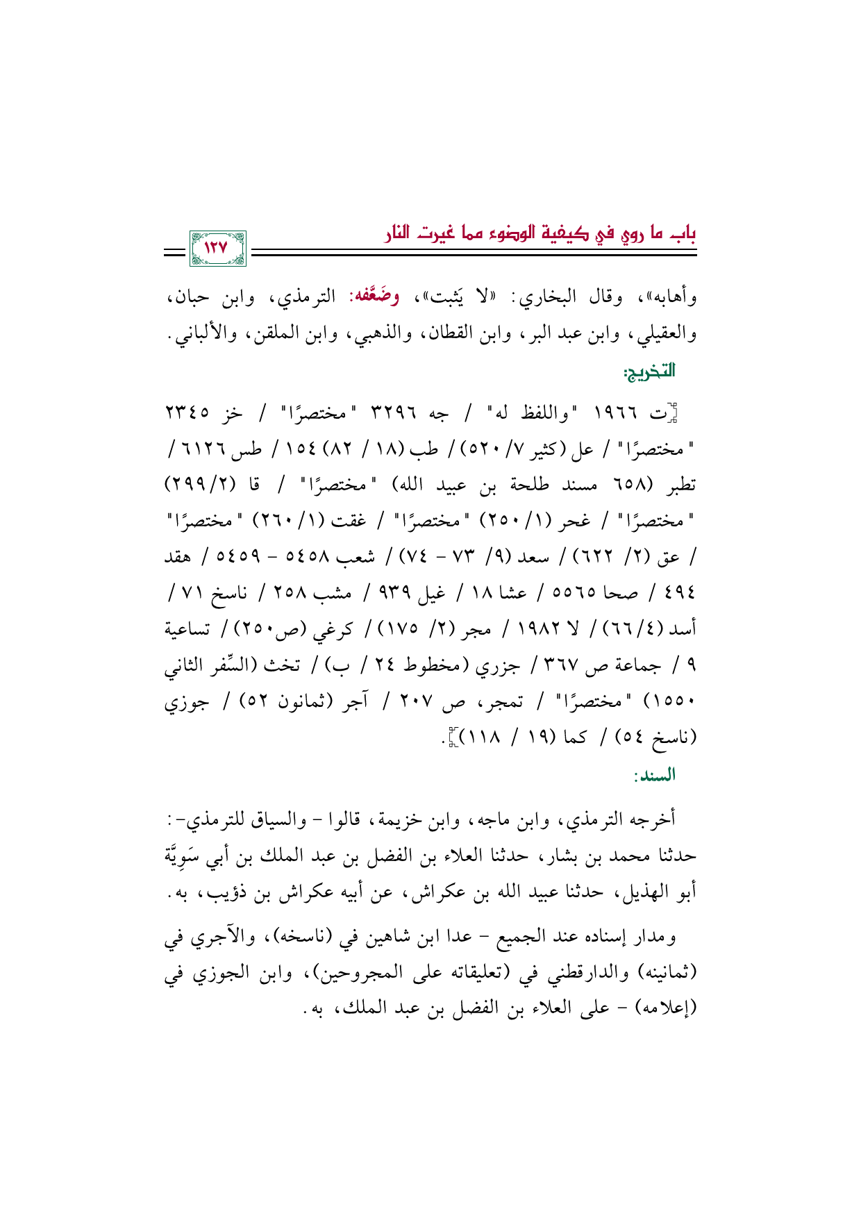 أخرجه الترمذي، وابن ماجه، وابن خزيمة، قالوا - والسياق للترمذي -: حدثنا محمد بن بشار، حدثنا العلاء بن الفضل بن عبد الملك بن أبي سَوِيَّة أبو الهذيل، حدثنا عبيد الله بن عكراش، عن أبيه عكراش بن ذؤيب، به.