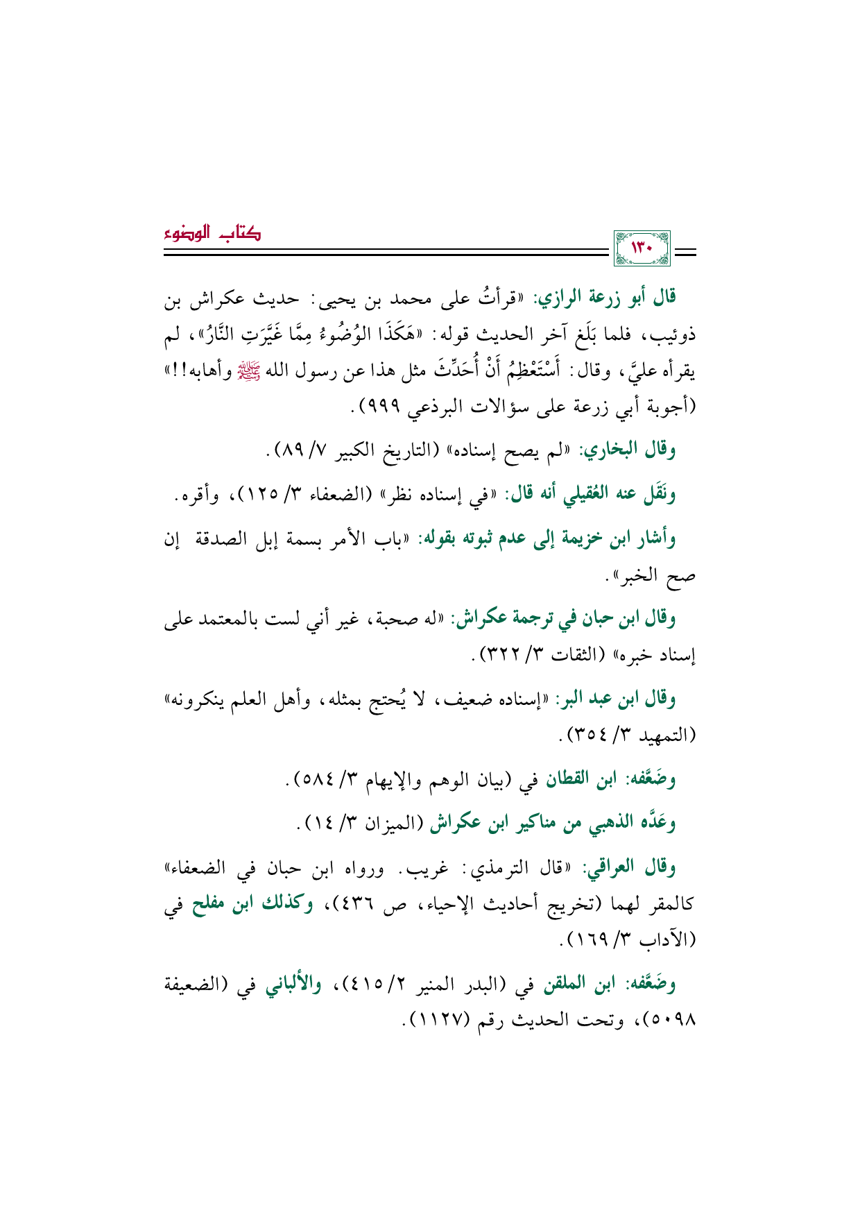 قال أبو زرعة الرازي: ((قرأتُ على محمد بن يحيى: حديث عكراش بن ذوئيب، فلما بَلَغ آخر الحديث قوله: «هَكَذَا الوُضُوءُ مِمَّا غَيَّرَتِ النَّارُ»، لم يقرأه عليَّ، وقال: أَسْتَعْظِمُ أَنْ أُحَدِّثَ مثل هذا عن رسول الله صلى الله عليه وسلم وأهابه! ! )) (أجوبة أبي زرعة على سؤالات البرذعي ٩٩٩).