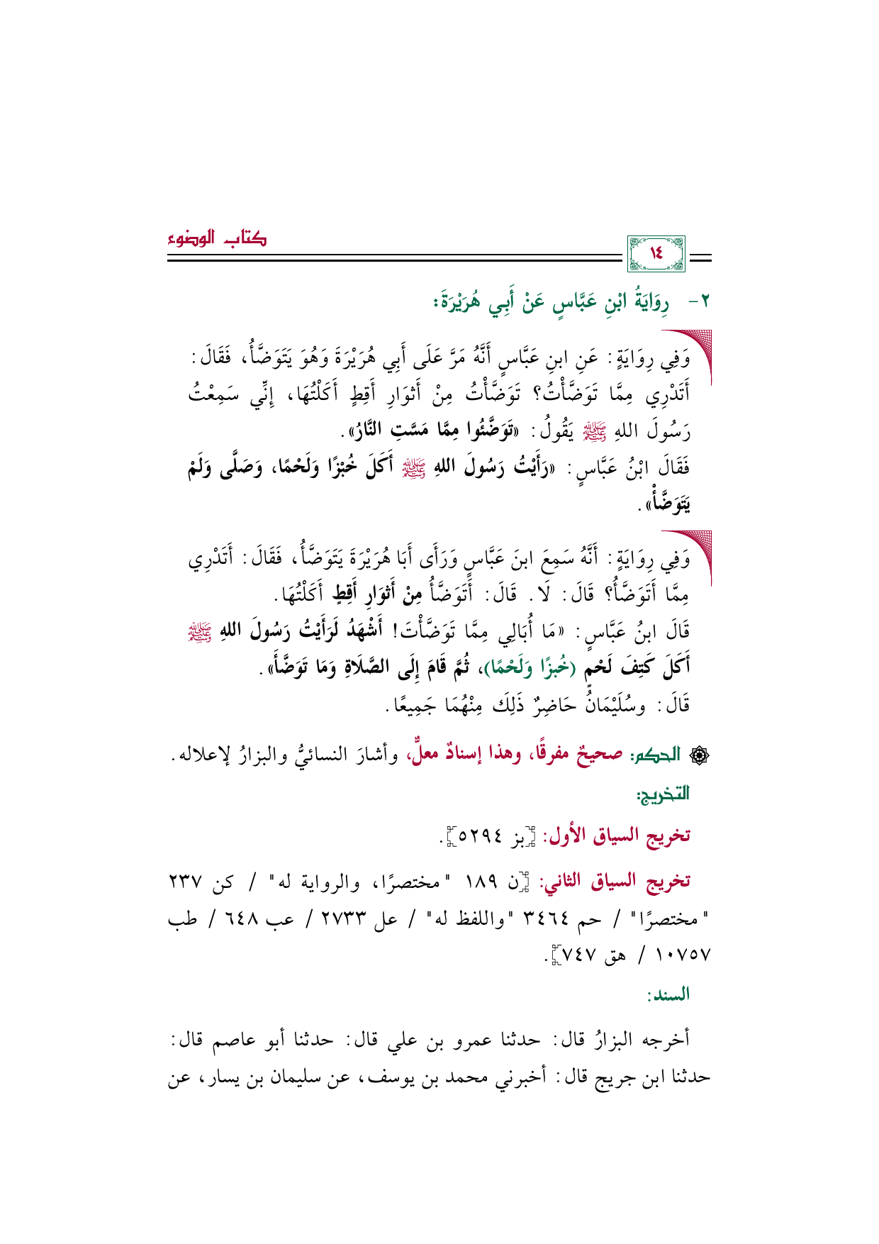 قَالَ ابنُ عَبَّاسٍ: ((مَا أُبَالِي مِمَّا تَوَضَّأْتَ! أَشْهَدُ لَرَأَيْتُ رَسُولَ اللهِ صلى الله عليه وسلم أَكَلَ كَتِفَ لَحْمٍ (خُبزًا وَلَحْمًا)، ثُمَّ قَامَ إِلَى الصَّلَاةِ وَمَا تَوَضَّأَ)).