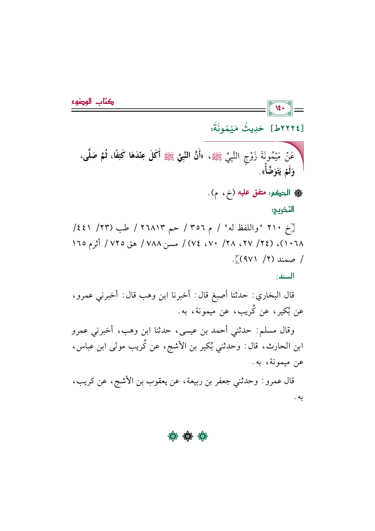 ◼ عَنْ مَيْمُونَةَ زَوْجِ النَّبِيِّ صلى الله عليه وسلم، ((أَنَّ النَّبِيَّ صلى الله عليه وسلم أَكَلَ عِنْدَهَا كَتِفًا، ثُمَّ صَلَّى، وَلَمْ يَتَوَضَّأْ)).