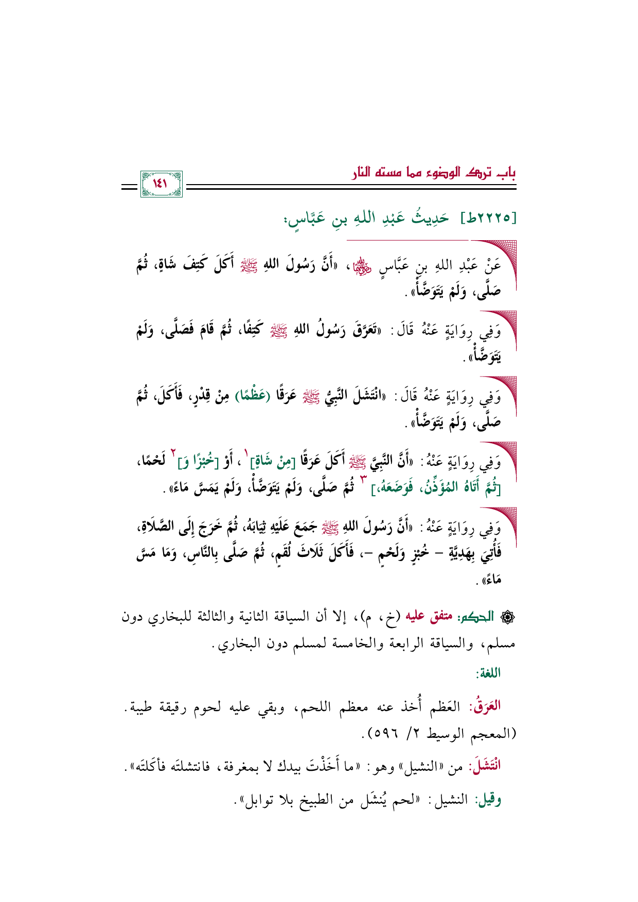 ◼ عَنْ عَبْدِ اللهِ بنِ عَبَّاسٍ رضي الله عنهمَا، ((أَنَّ رَسُولَ اللهِ صلى الله عليه وسلم أَكَلَ كَتِفَ شَاةٍ، ثُمَّ صَلَّى، وَلَمْ يَتَوَضَّأْ)).