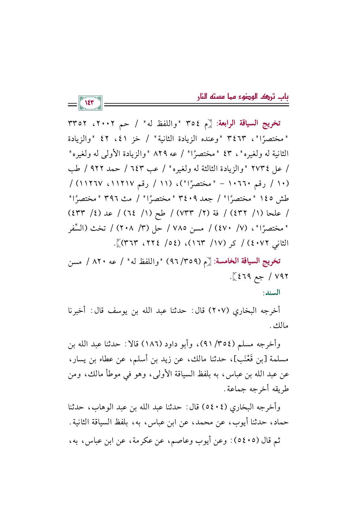وأخرجه مسلم (٣٥٤/ ٩١)، وأبو داود (١٨٦) قالا: حدثنا عبد الله بن مسلمة [بن قَعْنَب]، حدثنا مالك، عن زيد بن أسلم، عن عطاء بن يسار، عن عبد الله بن عباس، به بلفظ السياقة الأولى، وهو في موطأ مالك، ومن طريقه أخرجه جماعة.