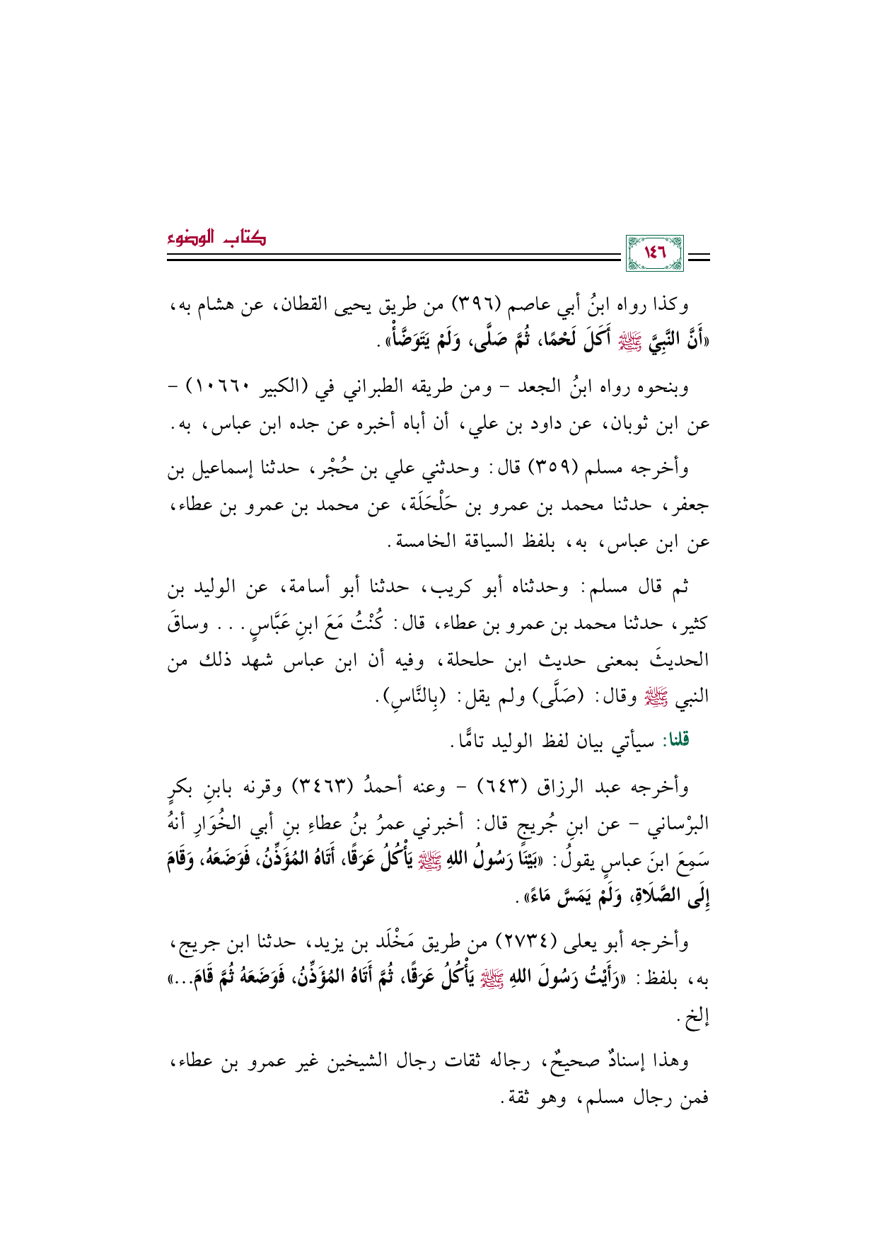 وأخرجه عبد الرزاق (٦٤٣) -وعنه أحمدُ (٣٤٦٣) وقرنه بابنِ بكرٍ البرْساني- عن ابنِ جُريجٍ قال: أخبرني عمرُ بنُ عطاءِ بنِ أبي الخُوَارِ أنهُ سَمِعَ ابنَ عباسٍ يقولُ: ((بَيْنَا رَسُولُ اللهِ صلى الله عليه وسلم يَأْكُلُ عَرَقًا، أَتَاهُ المُؤَذِّنُ، فَوَضَعَهُ، وَقَامَ إِلَى الصَّلَاةِ، وَلَمْ يَمَسَّ مَاءً)).