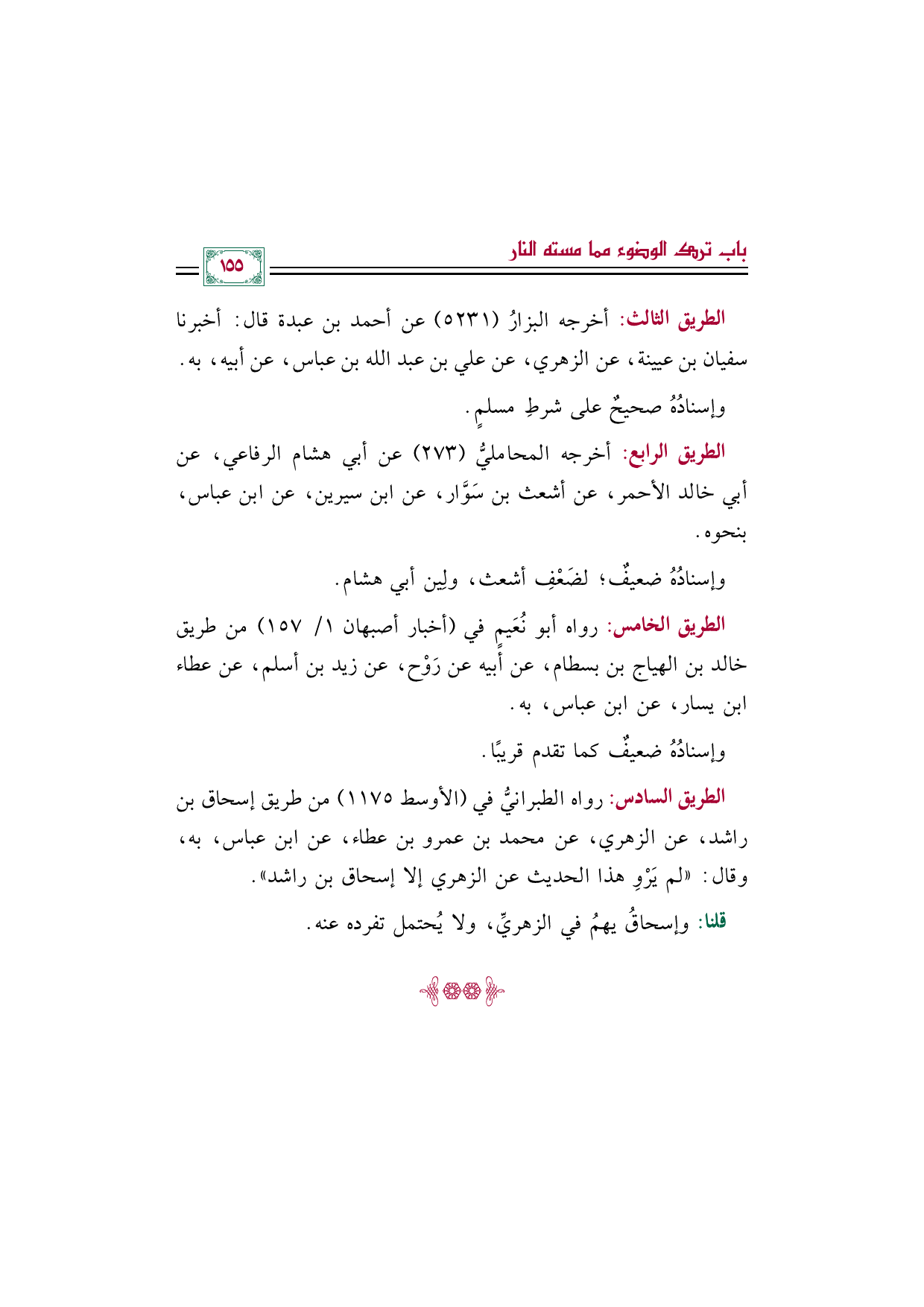 الطريق السادس: رواه الطبرانيُّ في (الأوسط ١١٧٥) من طريق إسحاق بن راشد، عن الزهري، عن محمد بن عمرو بن عطاء، عن ابن عباس، به، وقال: "لم يَرْوِ هذا الحديث عن الزهري إلا إسحاق بن راشد".