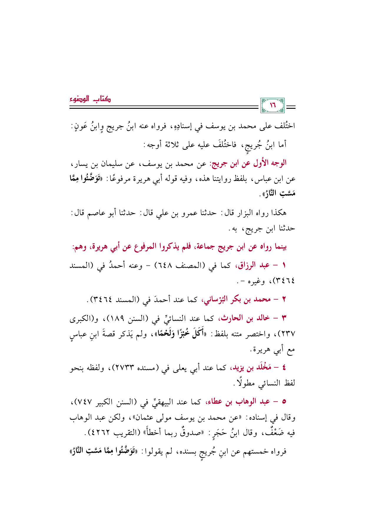الوجه الأول عن ابن جريج: عن محمد بن يوسف، عن سليمان بن يسار، عن ابن عباس، بلفظ روايتنا هذه، وفيه قوله أبي هريرة مرفوعًا: ((تَوَضَّئُوا مِمَّا مَسَّتِ النَّارُ)).