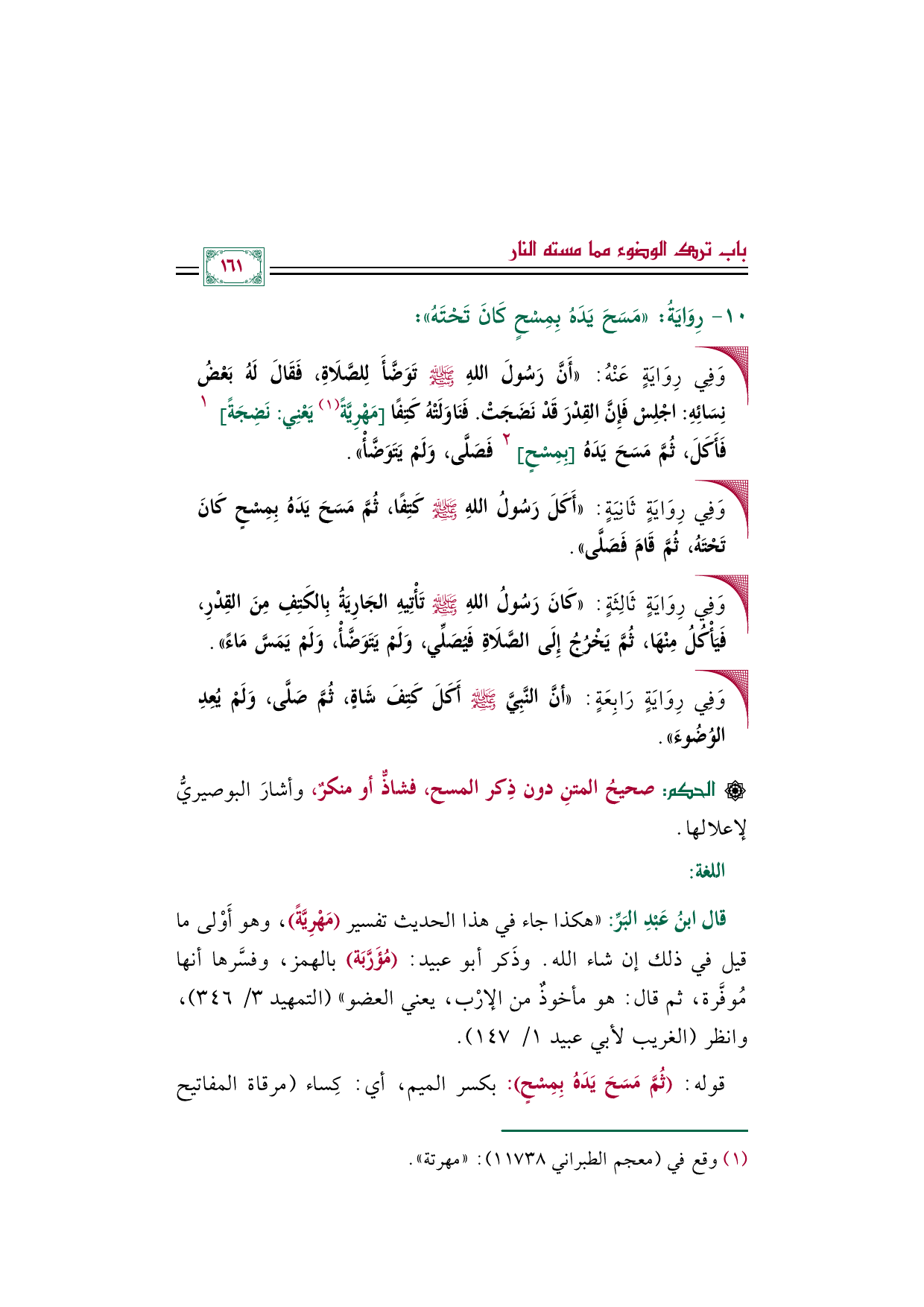 • وَفِي رِوَايَةٍ عَنْهُ: ((أَنَّ رَسُولَ اللهِ صلى الله عليه وسلم تَوَضَّأَ لِلصَّلَاةِ، فَقَالَ لَهُ بَعْضُ نِسَائِهِ: اجْلِسْ فَإِنَّ القِدْرَ قَدْ نَضَجَتْ. فَنَاوَلَتْهُ كَتِفًا [مَهْرِيَّةً (¬١) يَعْنِي: نَضِجَةً] ١ فَأَكَلَ، ثُمَّ مَسَحَ يَدَهُ [بِمِسْحٍ] ٢ فَصَلَّى، وَلَمْ يَتَوَضَّأْ)).