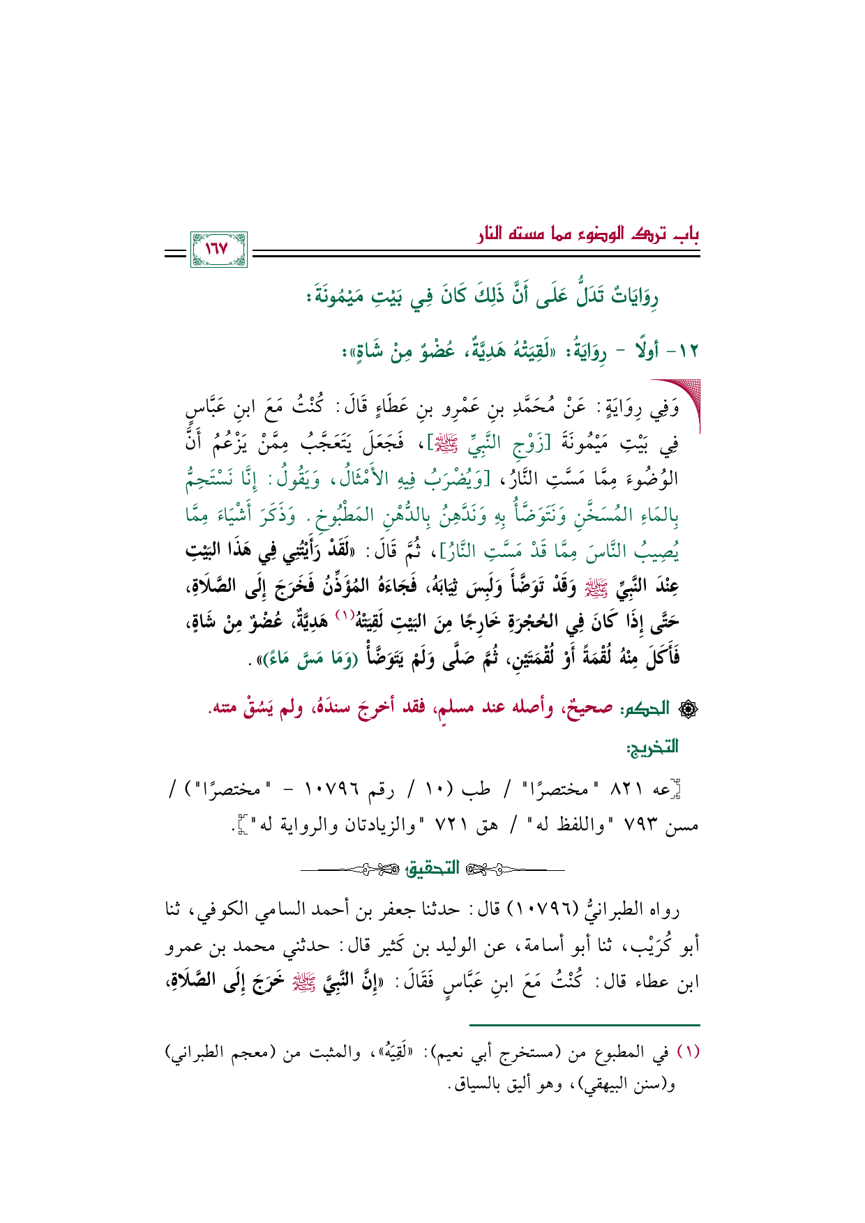 • وَفِي رِوَايَةٍ: عَنْ مُحَمَّدِ بنِ عَمْرِو بنِ عَطَاءٍ قَالَ: كُنْتُ مَعَ ابنِ عَبَّاسٍ فِي بَيْتِ مَيْمُونَةَ [زَوْجِ النَّبِيِّ صلى الله عليه وسلم]، فَجَعَلَ يَتَعَجَّبُ مِمَّنْ يَزْعُمُ أَنَّ الوُضُوءَ مِمَّا مَسَّتِ النَّارُ، [وَيُضْرَبُ فِيهِ الأَمْثَالُ، وَيَقُولُ: إِنَّا نَسْتَحِمُّ بِالمَاءِ المُسَخَّنِ وَنَتَوَضَّأُ بِهِ وَنَدَّهِنُ بِالدُّهْنِ المَطْبُوخِ. وَذَكَرَ أَشْيَاءَ مِمَّا يُصِيبُ النَّاسَ مِمَّا قَدْ مَسَّتِ النَّارُ]، ثُمَّ قَالَ: ((لَقَدْ رَأَيْتُنِي فِي هَذَا البَيْتِ عِنْدَ النَّبِيِّ صلى الله عليه وسلم وَقَدْ تَوَضَّأَ وَلَبِسَ ثِيَابَهُ، فَجَاءَهُ المُؤَذِّنُ فَخَرَجَ إِلَى الصَّلَاةِ، حَتَّى إِذَا كَانَ فِي الحُجْرَةِ خَارِجًا مِنَ البَيْتِ لَقِيَتْهُ (¬١) هَدِيَّةٌ، عُضْوٌ مِنْ شَاةٍ، فَأَكَلَ مِنْهُ لُقْمَةً أَوْ لُقْمَتَيْنِ، ثُمَّ صَلَّى وَلَمْ يَتَوَضَّأْ (وَمَا مَسَّ مَاءً))).