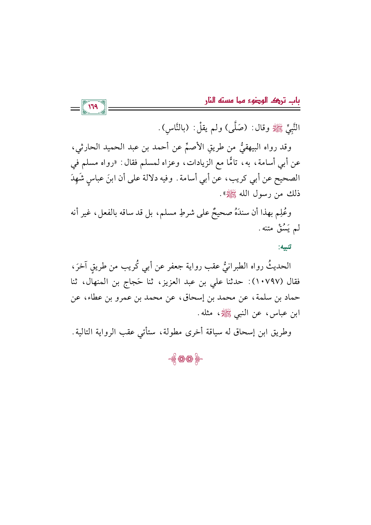 وقد رواه البيهقيُّ من طريقِ الأصمِّ عن أحمد بن عبد الحميد الحارثي، عن أبي أسامة، به، تامًّا مع الزيادات، وعزاه لمسلم فقال: "رواه مسلم في الصحيح عن أبي كريب، عن أبي أسامة. وفيه دلالة على أن ابنَ عباسٍ شَهِدَ ذلك من رسول الله صلى الله عليه وسلم".