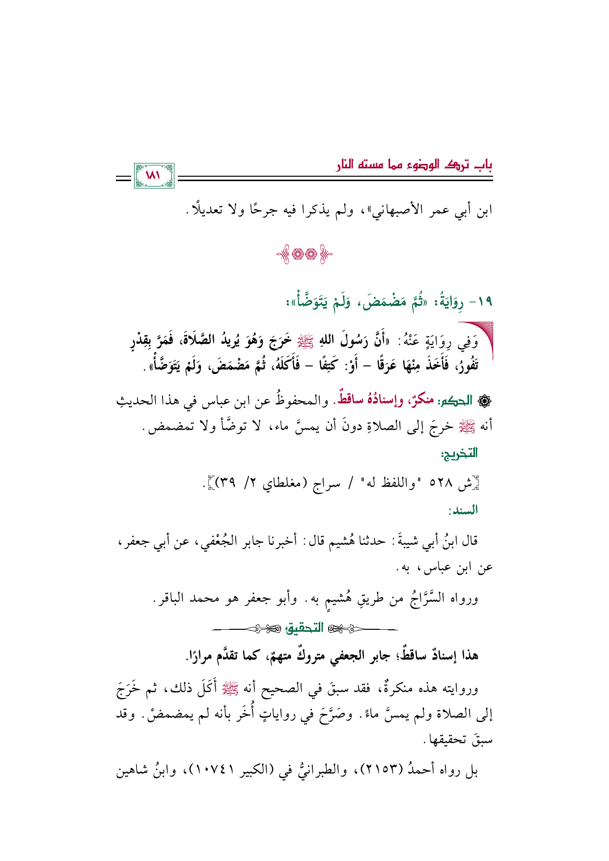 وروايته هذه منكرةٌ، فقد سبقَ في الصحيح أنه صلى الله عليه وسلم أَكَلَ ذلك، ثم خَرَجَ إلى الصلاة ولم يمسَّ ماءً. وصَرَّحَ في رواياتٍ أُخَر بأنه لم يمضمضْ. وقد سبقَ تحقيقها.