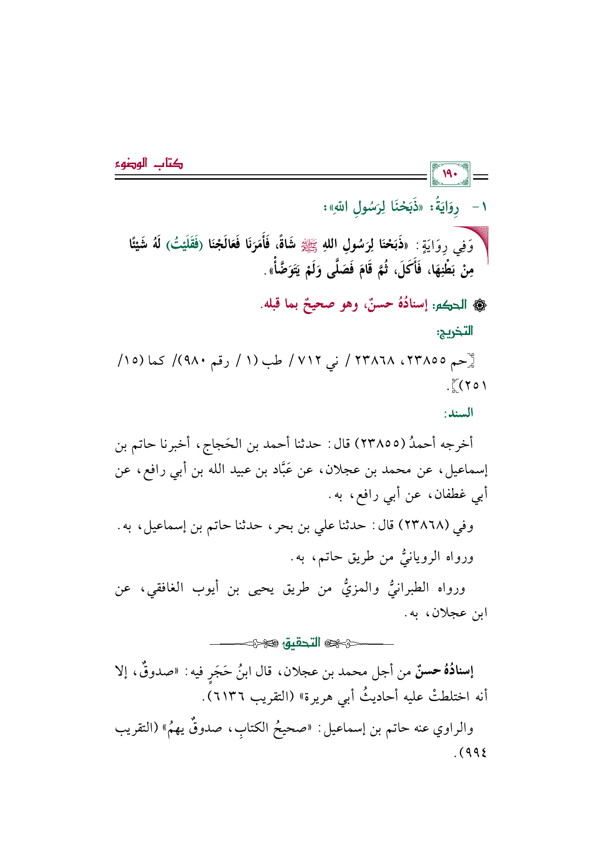 أخرجه أحمدُ (٢٣٨٥٥) قال: حدثنا أحمد بن الحَجاج، أخبرنا حاتم بن إسماعيل، عن محمد بن عجلان، عن عَبَّاد بن عبيد الله بن أبي رافع، عن أبي غطفان، عن أبي رافع، به.