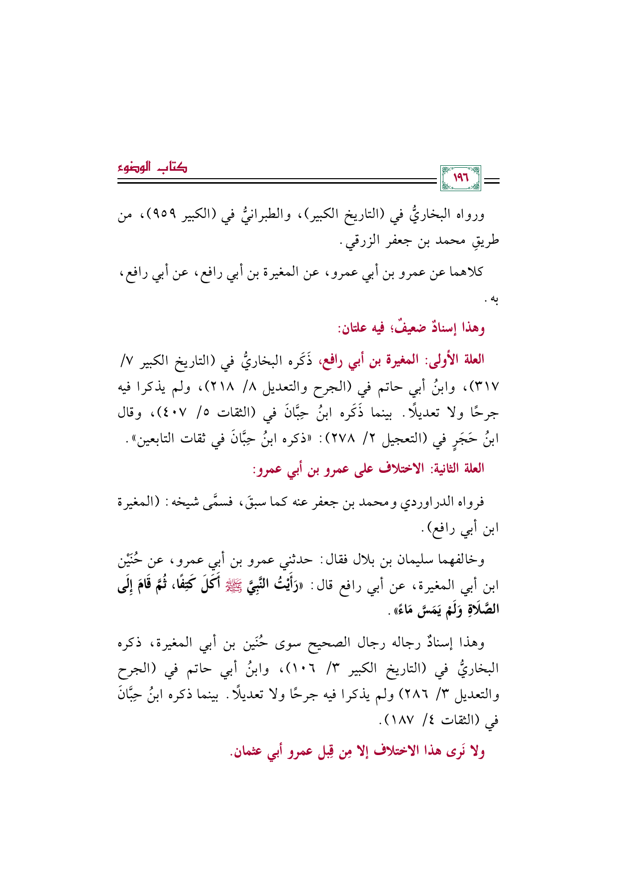 وخالفهما سليمان بن بلال فقال: حدثني عمرو بن أبي عمرو، عن حُنَيْن بن أبي المغيرة، عن أبي رافع قال: ((رَأَيْتُ النَّبِيَّ صلى الله عليه وسلم أَكَلَ كَتِفًا، ثُمَّ قَامَ إِلَى الصَّلَاةِ وَلَمْ يَمَسَّ مَاءً)).