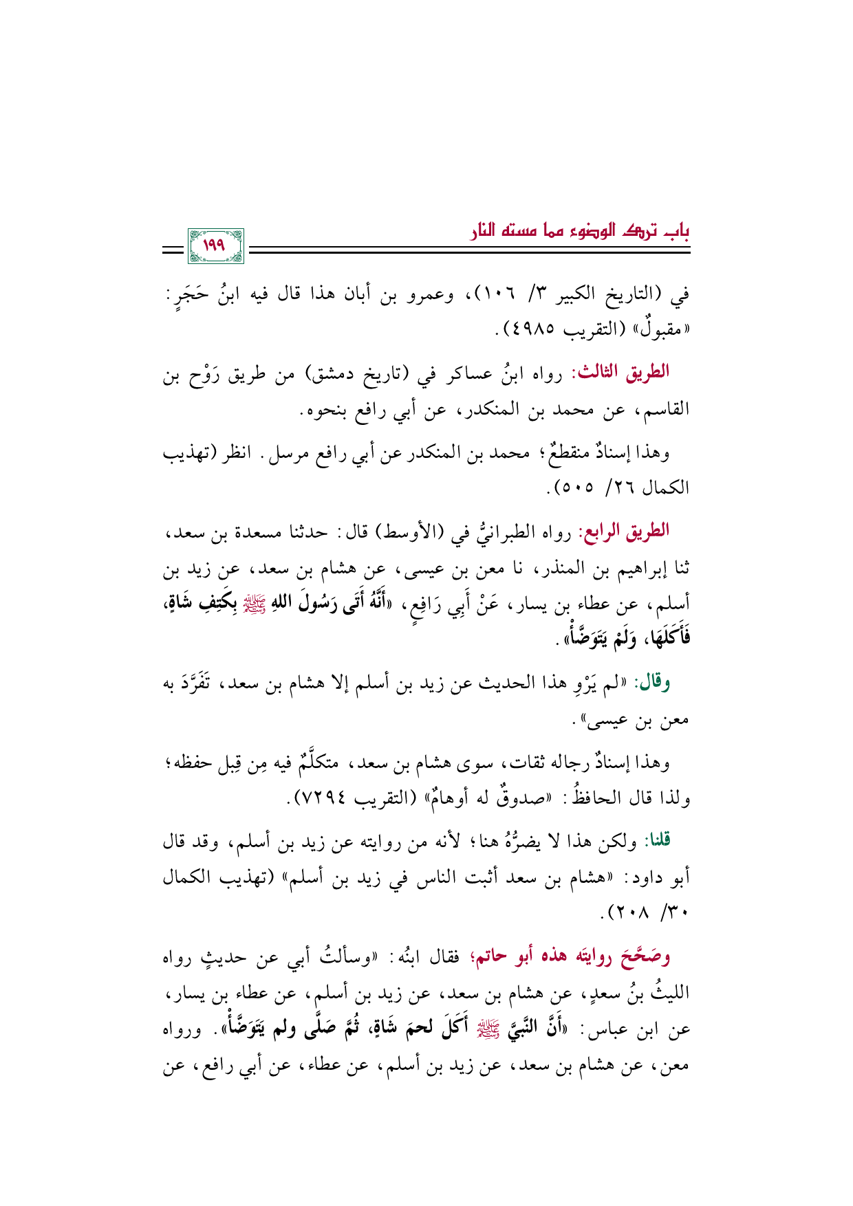 الطريق الرابع: رواه الطبرانيُّ في (الأوسط) قال: حدثنا مسعدة بن سعد، ثنا إبراهيم بن المنذر، نا معن بن عيسى، عن هشام بن سعد، عن زيد بن أسلم، عن عطاء بن يسار، عَنْ أَبِي رَافِعٍ، ((أَنَّهُ أَتَى رَسُولَ اللهِ صلى الله عليه وسلم بِكَتِفِ شَاةٍ، فَأَكَلَهَا، وَلَمْ يَتَوَضَّأْ)).