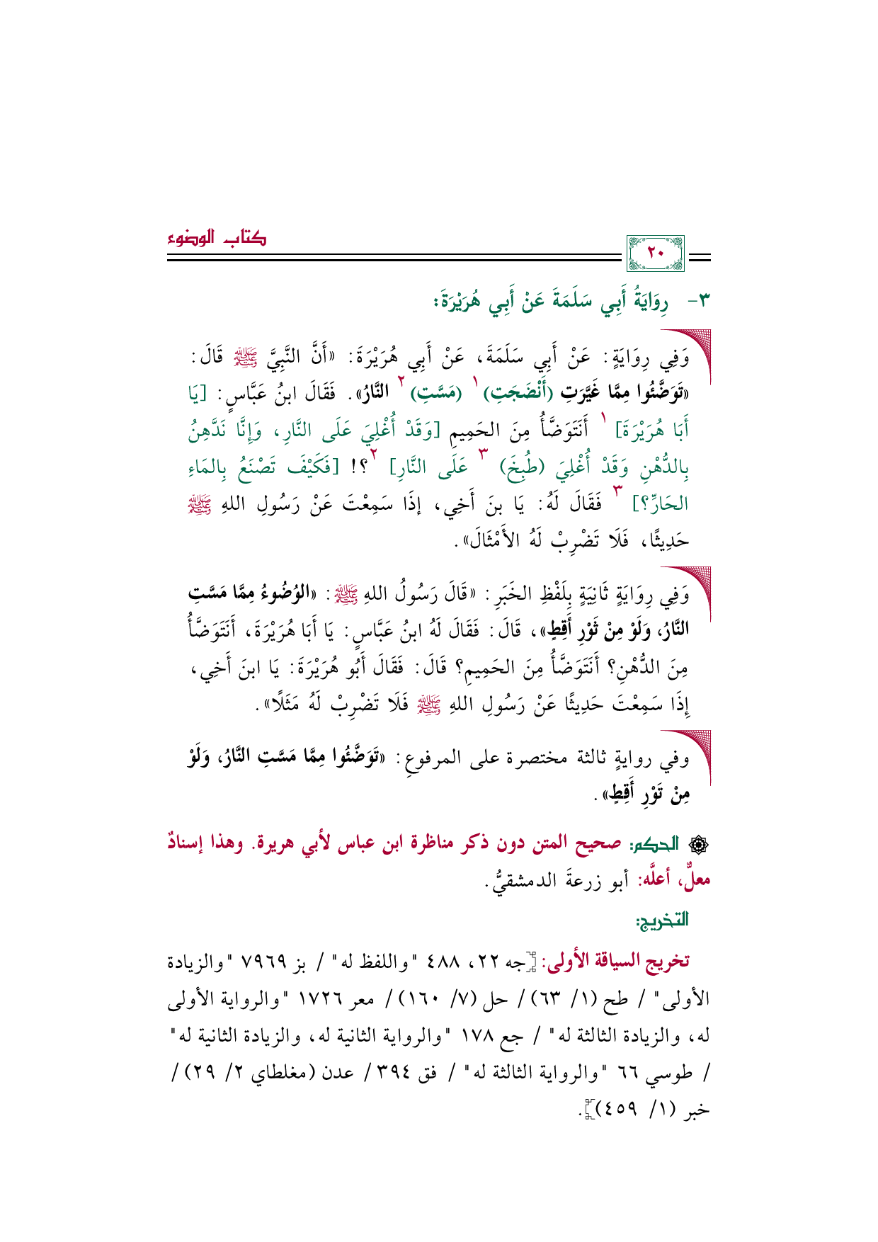 • وَفِي رِوَايَةٍ: عَنْ أَبِي سَلَمَةَ، عَنْ أَبِي هُرَيْرَةَ: ((أَنَّ النَّبِيَّ صلى الله عليه وسلم قَالَ: ((تَوَضَّئُوا مِمَّا غَيَّرَتِ (أَنْضَجَتِ) ١ (مَسَّتِ) ٢ النَّارُ)). فَقَالَ ابنُ عَبَّاسٍ: [يَا أَبَا هُرَيْرَةَ] ١ أَنَتَوَضَّأُ مِنَ الحَمِيمِ [وَقَدْ أُغْلِيَ عَلَى النَّارِ، وَإِنَّا نَدَّهِنُ بِالدُّهْنِ وَقَدْ أُغْلِيَ (طُبِخَ) ٣ عَلَى النَّارِ] ٢؟! [فَكَيْفَ تَصْنَعُ بِالمَاءِ الحَارِّ؟] ٣ فَقَالَ لَهُ: يَا بنَ أَخِي، إذَا سَمِعْتَ عَنْ رَسُولِ اللهِ صلى الله عليه وسلم حَدِيثًا، فَلَا تَضْرِبْ لَهُ الأَمْثَالَ)).