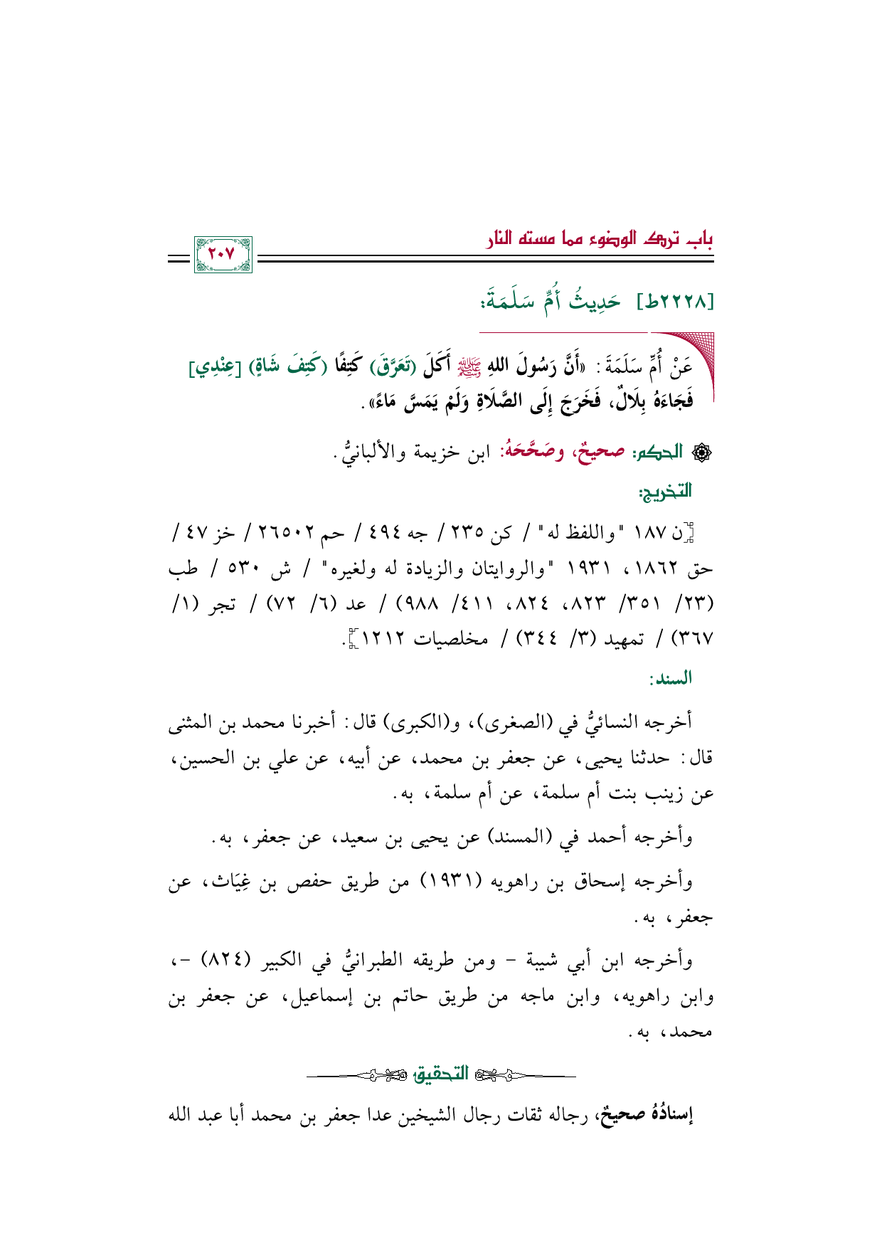 أخرجه النسائيُّ في (الصغرى)، و (الكبرى) قال: أخبرنا محمد بن المثنى قال: حدثنا يحيى، عن جعفر بن محمد، عن أبيه، عن علي بن الحسين، عن زينب بنت أم سلمة، عن أم سلمة، به.