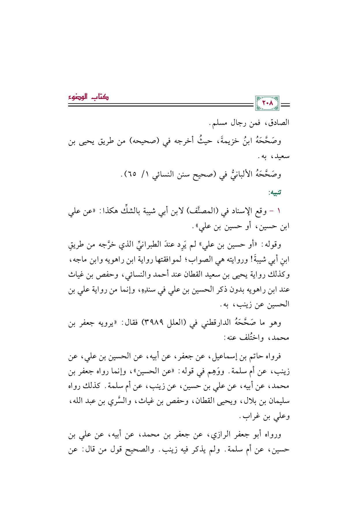 فرواه حاتم بن إسماعيل، عن جعفر، عن أبيه، عن الحسين بن علي، عن زينب، عن أم سلمة. ووَهِم في قوله: "عن الحسين"، وإنما رواه جعفر بن محمد، عن أبيه، عن علي بن حسين، عن زينب، عن أم سلمة. كذلك رواه سليمان بن بلال، ويحيى القطان، وحفص بن غياث، والسَّري بن عبد الله، وعلي بن غراب.