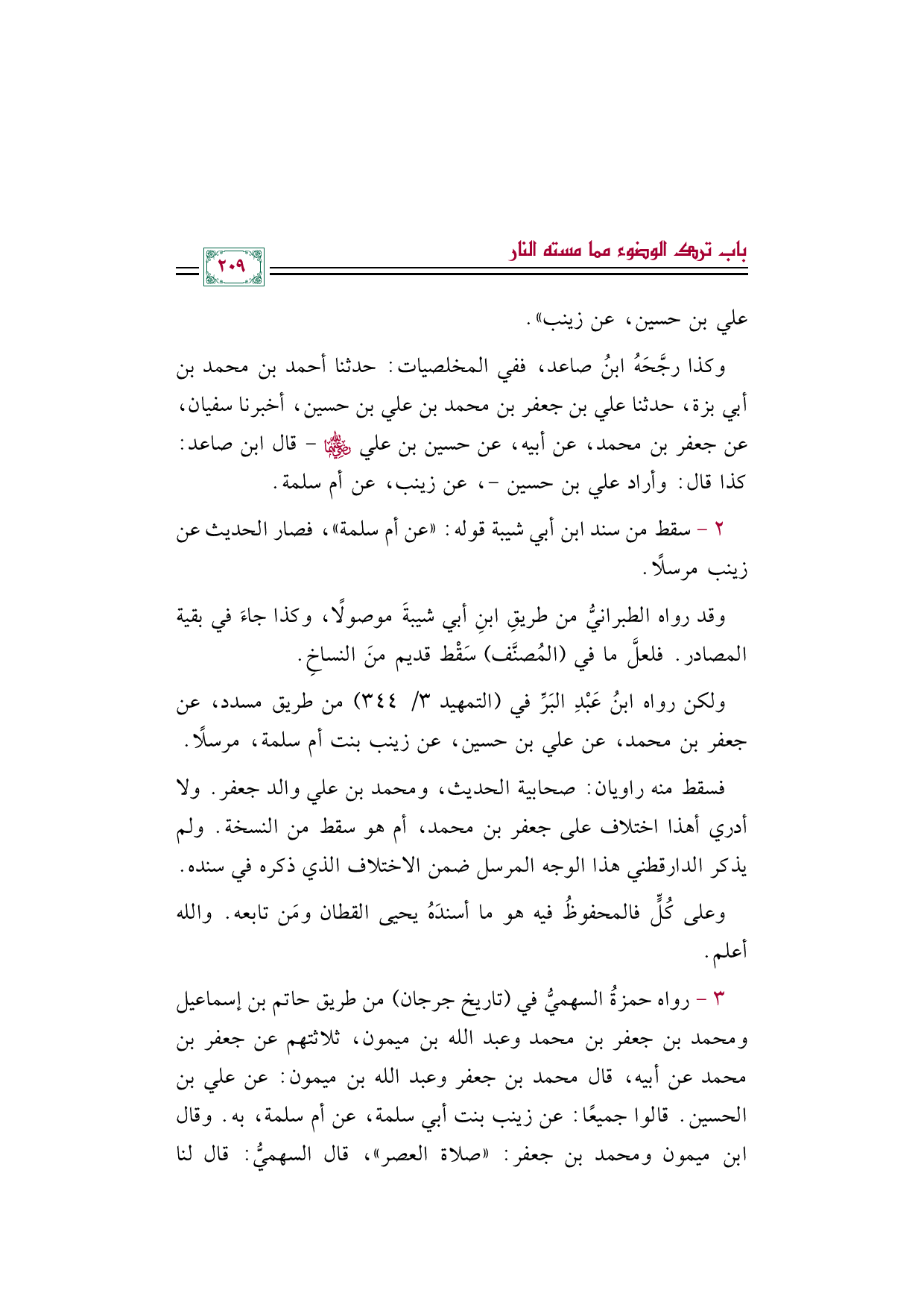 وكذا رجَّحَهُ ابنُ صاعد، ففي المخلصيات: حدثنا أحمد بن محمد بن أبي بزة، حدثنا علي بن جعفر بن محمد بن علي بن حسين، أخبرنا سفيان، عن جعفر بن محمد، عن أبيه، عن حسين بن علي رضي الله عنهما -قال ابن صاعد: كذا قال: وأراد علي بن حسين-، عن زينب، عن أم سلمة.