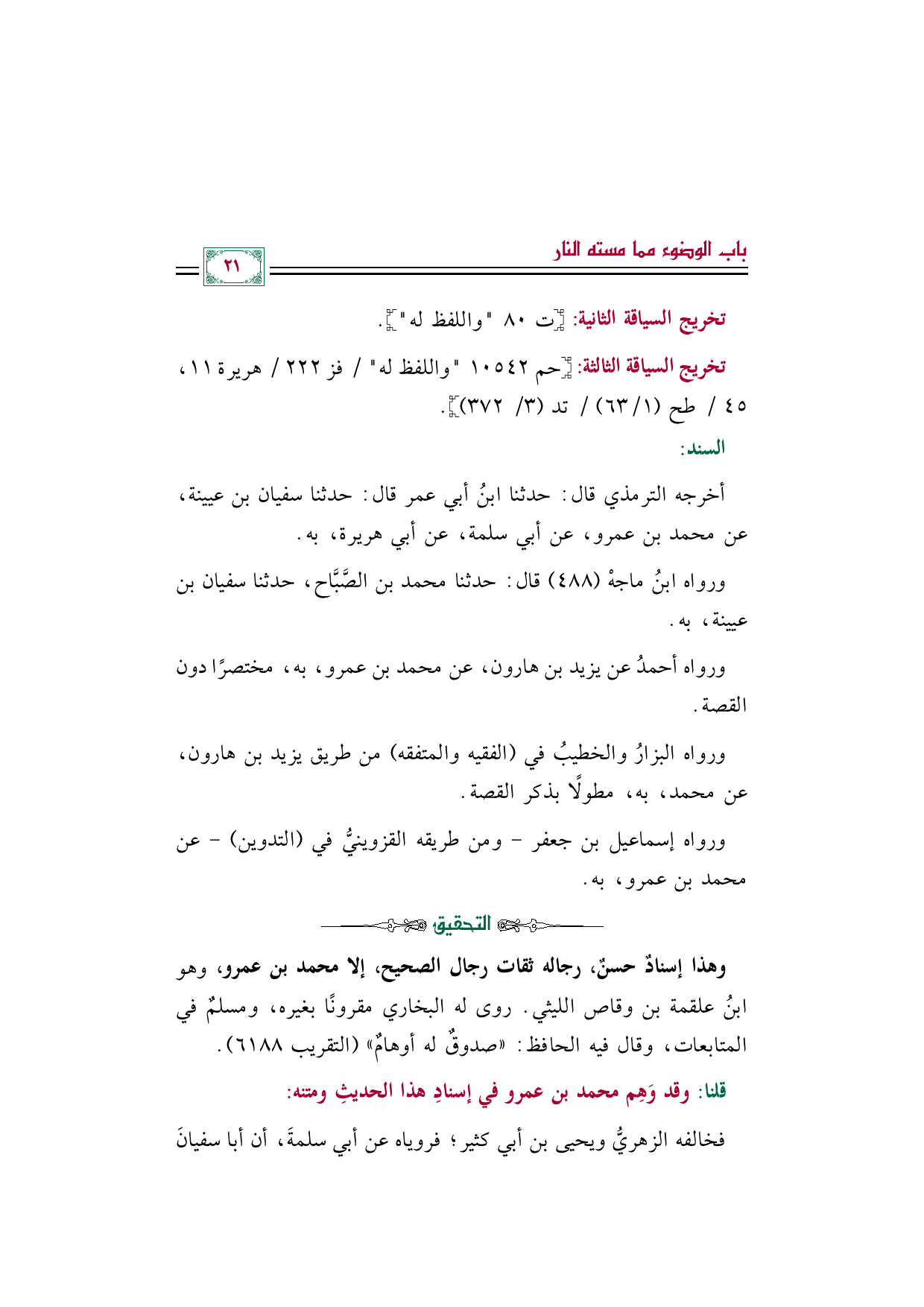 وهذا إسنادٌ حسنٌ، رجاله ثقات رجال الصحيح، إلا محمد بن عمرو، وهو ابنُ علقمة بن وقاص الليثي. روى له البخاري مقرونًا بغيره، ومسلمٌ في المتابعات، وقال فيه الحافظ: "صدوقٌ له أوهامٌ" (التقريب ٦١٨٨).