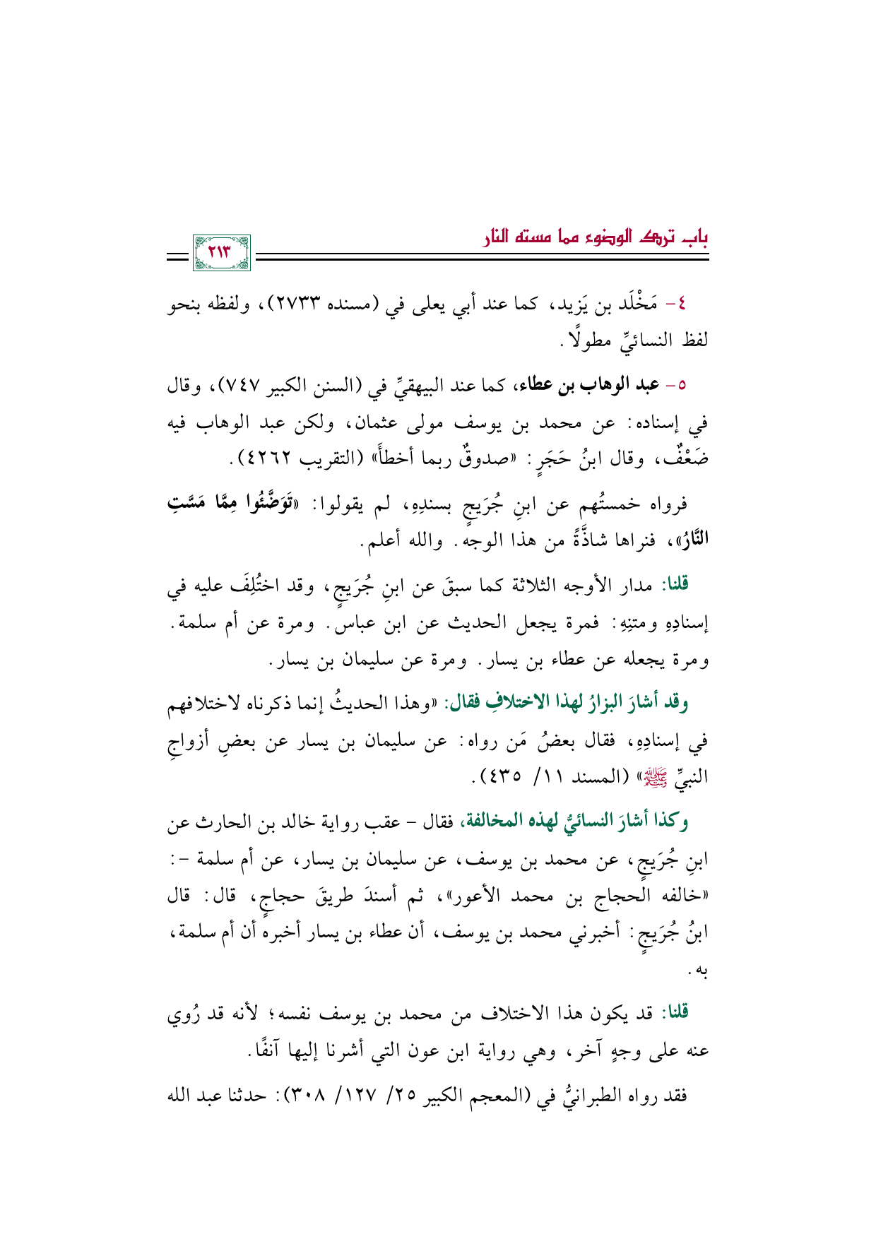 وكذا أشارَ النسائيُّ لهذه المخالفة، فقال -عقب رواية خالد بن الحارث عن ابنِ جُرَيجٍ، عن محمد بن يوسف، عن سليمان بن يسار، عن أم سلمة-: ((خالفه الحجاج بن محمد الأعور))، ثم أسندَ طريقَ حجاجٍ، قال: قال ابنُ جُرَيجٍ: أخبرني محمد بن يوسف، أن عطاء بن يسار أخبره أن أم سلمة، به.