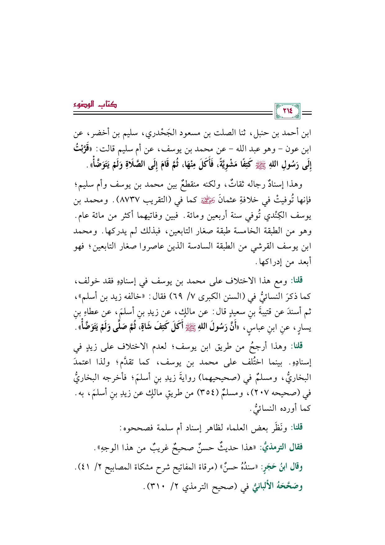 ابن أحمد بن حنبل، ثنا الصلت بن مسعود الجَحْدري، سليم بن أخضر، عن ابن عون -وهو عبد الله- عن محمد بن يوسف، عن أم سليم قالت: ((قَرَّبْتُ إِلَى رَسُولِ اللهِ صلى الله عليه وسلم كَتِفًا مَشْوِيَّةً، فَأَكَلَ مِنْهَا، ثُمَّ قَامَ إِلَى الصَّلَاةِ وَلَمْ يَتَوَضَّأْ)).