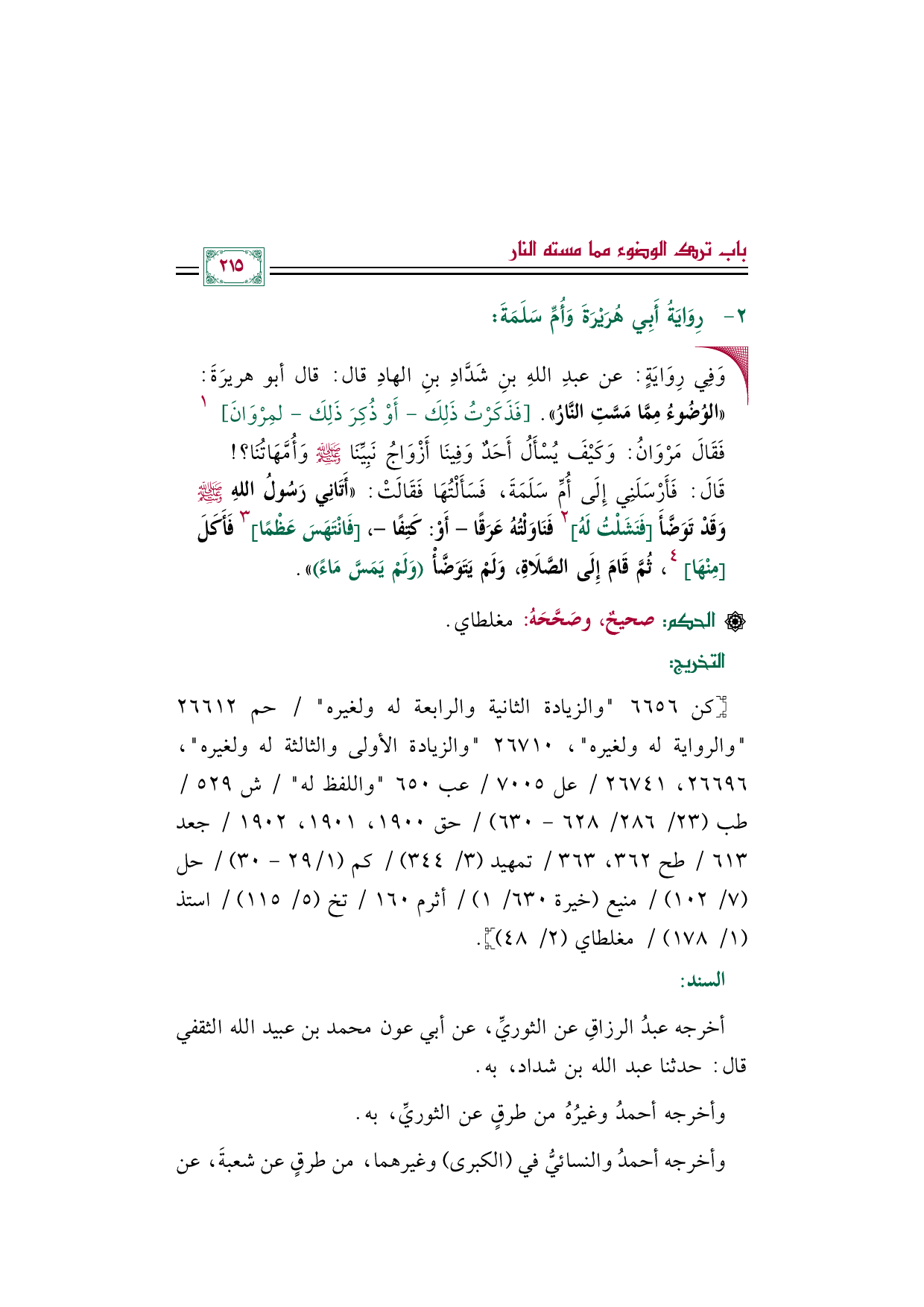 • وَفِي رِوَايَةٍ: عن عبدِ اللهِ بنِ شَدَّادِ بنِ الهادِ قال: قال أبو هريرَةَ: ((الوُضُوءُ مِمَّا مَسَّتِ النَّارُ)). [فَذَكَرْتُ ذَلِكَ -أَوْ ذُكِرَ ذَلِكَ- لمِرْوَانَ] ١ فَقَالَ مَرْوَانُ: وَكَيْفَ يُسْأَلُ أَحَدٌ وَفِينَا أَزْوَاجُ نَبِيِّنَا صلى الله عليه وسلم وَأُمَّهَاتُنَا؟!